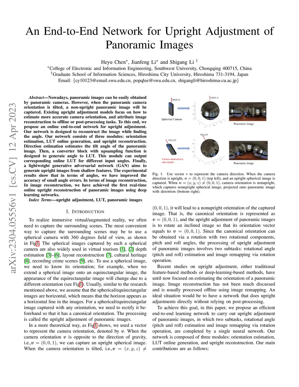 Nowadays, panoramic images can be easily obtained by panoramic cameras. However, when the panoramic camera orientation is tilted, a non-upright panoramic image will be captured. Existing upright adjustment models focus on how to estimate more accurate camera orientation, and attribute image reconstruction to offline or post-processing tasks. To this end, we propose an online end-to-end network for upright adjustment. Our network is designed to reconstruct the image while finding the angle. Our network consists of three modules: orientation estimation, LUT online generation, and upright reconstruction. Direction estimation estimates the tilt angle of the panoramic image. Then, a converter block with upsampling function is designed to generate angle to LUT. This module can output corresponding online LUT for different input angles. Finally, a lightweight generative adversarial network (GAN) aims to generate upright images from shallow features. The experimental results show that in terms of angles, we have improved the accuracy of small angle errors. In terms of image reconstruction, In image reconstruction, we have achieved the first real-time online upright reconstruction of panoramic images using deep learning networks.