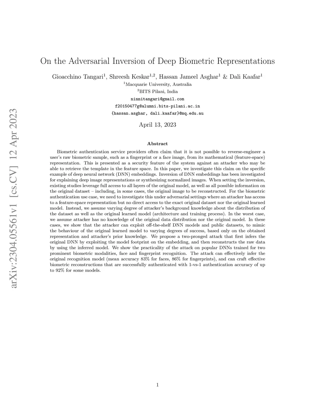 Biometric authentication service providers often claim that it is not possible to reverse-engineer a user's raw biometric sample, such as a fingerprint or a face image, from its mathematical (feature-space) representation. In this paper, we investigate this claim on the specific example of deep neural network (DNN) embeddings. Inversion of DNN embeddings has been investigated for explaining deep image representations or synthesizing normalized images. Existing studies leverage full access to all layers of the original model, as well as all possible information on the original dataset. For the biometric authentication use case, we need to investigate this under adversarial settings where an attacker has access to a feature-space representation but no direct access to the exact original dataset nor the original learned model. Instead, we assume varying degree of attacker's background knowledge about the distribution of the dataset as well as the original learned model (architecture and training process). In these cases, we show that the attacker can exploit off-the-shelf DNN models and public datasets, to mimic the behaviour of the original learned model to varying degrees of success, based only on the obtained representation and attacker's prior knowledge. We propose a two-pronged attack that first infers the original DNN by exploiting the model footprint on the embedding, and then reconstructs the raw data by using the inferred model. We show the practicality of the attack on popular DNNs trained for two prominent biometric modalities, face and fingerprint recognition. The attack can effectively infer the original recognition model (mean accuracy 83\% for faces, 86\% for fingerprints), and can craft effective biometric reconstructions that are successfully authenticated with 1-vs-1 authentication accuracy of up to 92\% for some models.