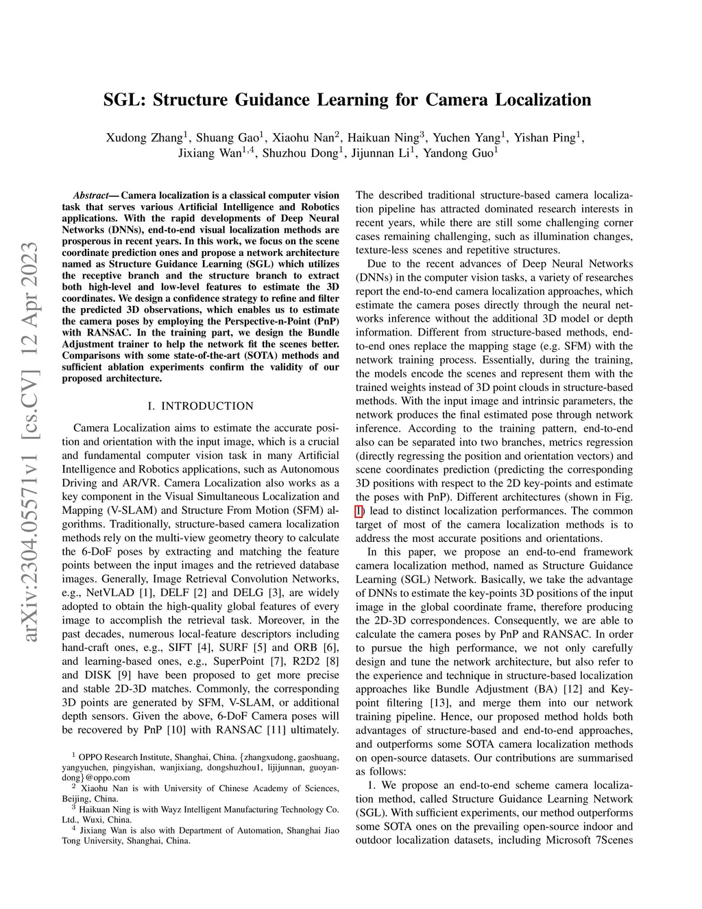 Camera localization is a classical computer vision task that serves various Artificial Intelligence and Robotics applications. With the rapid developments of Deep Neural Networks (DNNs), end-to-end visual localization methods are prosperous in recent years. In this work, we focus on the scene coordinate prediction ones and propose a network architecture named as Structure Guidance Learning (SGL) which utilizes the receptive branch and the structure branch to extract both high-level and low-level features to estimate the 3D coordinates. We design a confidence strategy to refine and filter the predicted 3D observations, which enables us to estimate the camera poses by employing the Perspective-n-Point (PnP) with RANSAC. In the training part, we design the Bundle Adjustment trainer to help the network fit the scenes better. Comparisons with some state-of-the-art (SOTA) methods and sufficient ablation experiments confirm the validity of our proposed architecture.