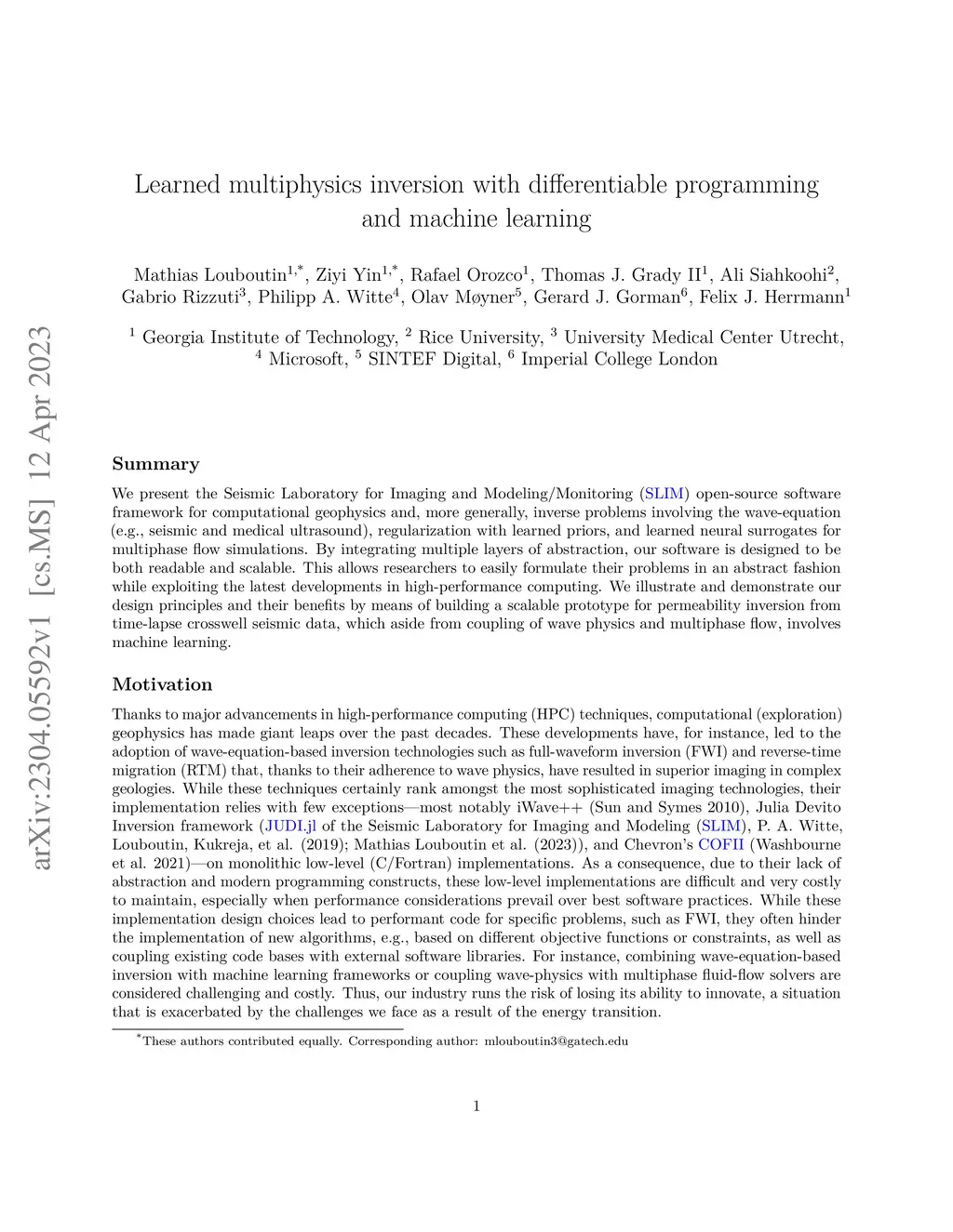 We present the Seismic Laboratory for Imaging and Modeling/Monitoring (SLIM) open-source software framework for computational geophysics and, more generally, inverse problems involving the wave-equation (e.g., seismic and medical ultrasound), regularization with learned priors, and learned neural surrogates for multiphase flow simulations. By integrating multiple layers of abstraction, our software is designed to be both readable and scalable. This allows researchers to easily formulate their problems in an abstract fashion while exploiting the latest developments in high-performance computing. We illustrate and demonstrate our design principles and their benefits by means of building a scalable prototype for permeability inversion from time-lapse crosswell seismic data, which aside from coupling of wave physics and multiphase flow, involves machine learning.