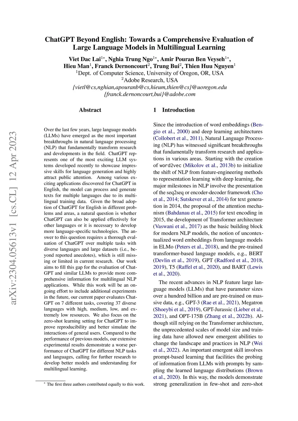 Over the last few years, large language models (LLMs) have emerged as the most important breakthroughs in natural language processing (NLP) that fundamentally transform research and developments in the field. ChatGPT represents one of the most exciting LLM systems developed recently to showcase impressive skills for language generation and highly attract public attention. Among various exciting applications discovered for ChatGPT in English, the model can process and generate texts for multiple languages due to its multilingual training data. Given the broad adoption of ChatGPT for English in different problems and areas, a natural question is whether ChatGPT can also be applied effectively for other languages or it is necessary to develop more language-specific technologies. The answer to this question requires a thorough evaluation of ChatGPT over multiple tasks with diverse languages and large datasets (i.e., beyond reported anecdotes), which is still missing or limited in current research. Our work aims to fill this gap for the evaluation of ChatGPT and similar LLMs to provide more comprehensive information for multilingual NLP applications. While this work will be an ongoing effort to include additional experiments in the future, our current paper evaluates ChatGPT on 7 different tasks, covering 37 diverse languages with high, medium, low, and extremely low resources. We also focus on the zero-shot learning setting for ChatGPT to improve reproducibility and better simulate the interactions of general users. Compared to the performance of previous models, our extensive experimental results demonstrate a worse performance of ChatGPT for different NLP tasks and languages, calling for further research to develop better models and understanding for multilingual learning.