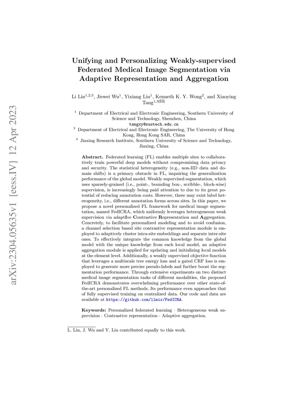 Federated learning (FL) enables multiple sites to collaboratively train powerful deep models without compromising data privacy and security. The statistical heterogeneity (e.g., non-IID data and domain shifts) is a primary obstacle in FL, impairing the generalization performance of the global model. Weakly supervised segmentation, which uses sparsely-grained (i.e., point-, bounding box-, scribble-, block-wise) supervision, is increasingly being paid attention to due to its great potential of reducing annotation costs. However, there may exist label heterogeneity, i.e., different annotation forms across sites. In this paper, we propose a novel personalized FL framework for medical image segmentation, named FedICRA, which uniformly leverages heterogeneous weak supervision via adaptIve Contrastive Representation and Aggregation. Concretely, to facilitate personalized modeling and to avoid confusion, a channel selection based site contrastive representation module is employed to adaptively cluster intra-site embeddings and separate inter-site ones. To effectively integrate the common knowledge from the global model with the unique knowledge from each local model, an adaptive aggregation module is applied for updating and initializing local models at the element level. Additionally, a weakly supervised objective function that leverages a multiscale tree energy loss and a gated CRF loss is employed to generate more precise pseudo-labels and further boost the segmentation performance. Through extensive experiments on two distinct medical image segmentation tasks of different modalities, the proposed FedICRA demonstrates overwhelming performance over other state-of-the-art personalized FL methods. Its performance even approaches that of fully supervised training on centralized data. Our code and data are available at https://github.com/llmir/FedICRA.