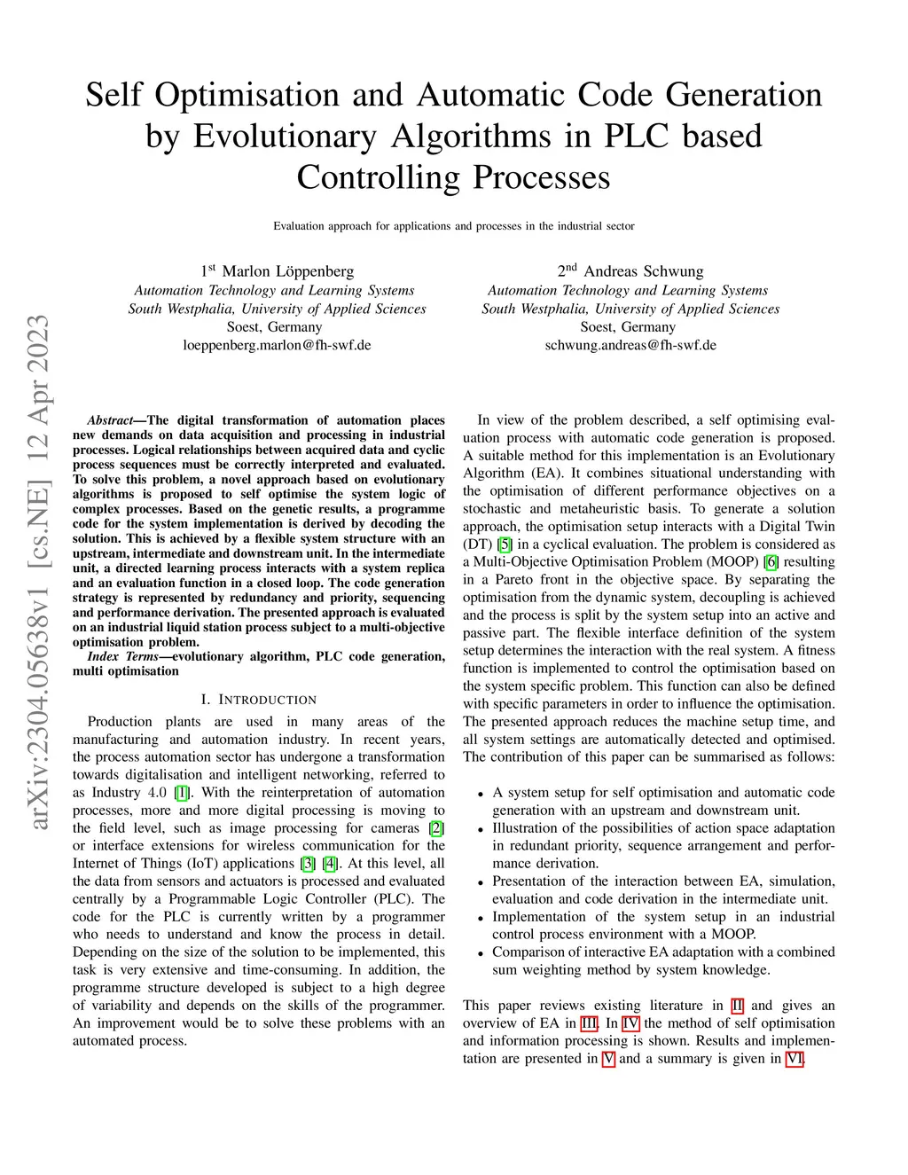 The digital transformation of automation places new demands on data acquisition and processing in industrial processes. Logical relationships between acquired data and cyclic process sequences must be correctly interpreted and evaluated. To solve this problem, a novel approach based on evolutionary algorithms is proposed to self optimise the system logic of complex processes. Based on the genetic results, a programme code for the system implementation is derived by decoding the solution. This is achieved by a flexible system structure with an upstream, intermediate and downstream unit. In the intermediate unit, a directed learning process interacts with a system replica and an evaluation function in a closed loop. The code generation strategy is represented by redundancy and priority, sequencing and performance derivation. The presented approach is evaluated on an industrial liquid station process subject to a multi-objective optimisation problem.