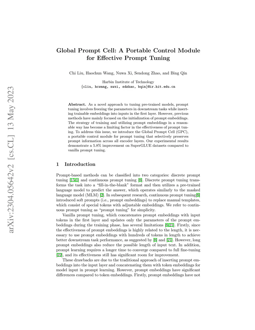 As a novel approach to tuning pre-trained models, prompt tuning involves freezing the parameters in downstream tasks while inserting trainable embeddings into inputs in the first layer. However, previous methods have mainly focused on the initialization of prompt embeddings. The strategy of training and utilizing prompt embeddings in a reasonable way has become a limiting factor in the effectiveness of prompt tuning. To address this issue, we introduce the Global Prompt Cell (GPC), a portable control module for prompt tuning that selectively preserves prompt information across all encoder layers. Our experimental results demonstrate a 5.8% improvement on SuperGLUE datasets compared to vanilla prompt tuning.