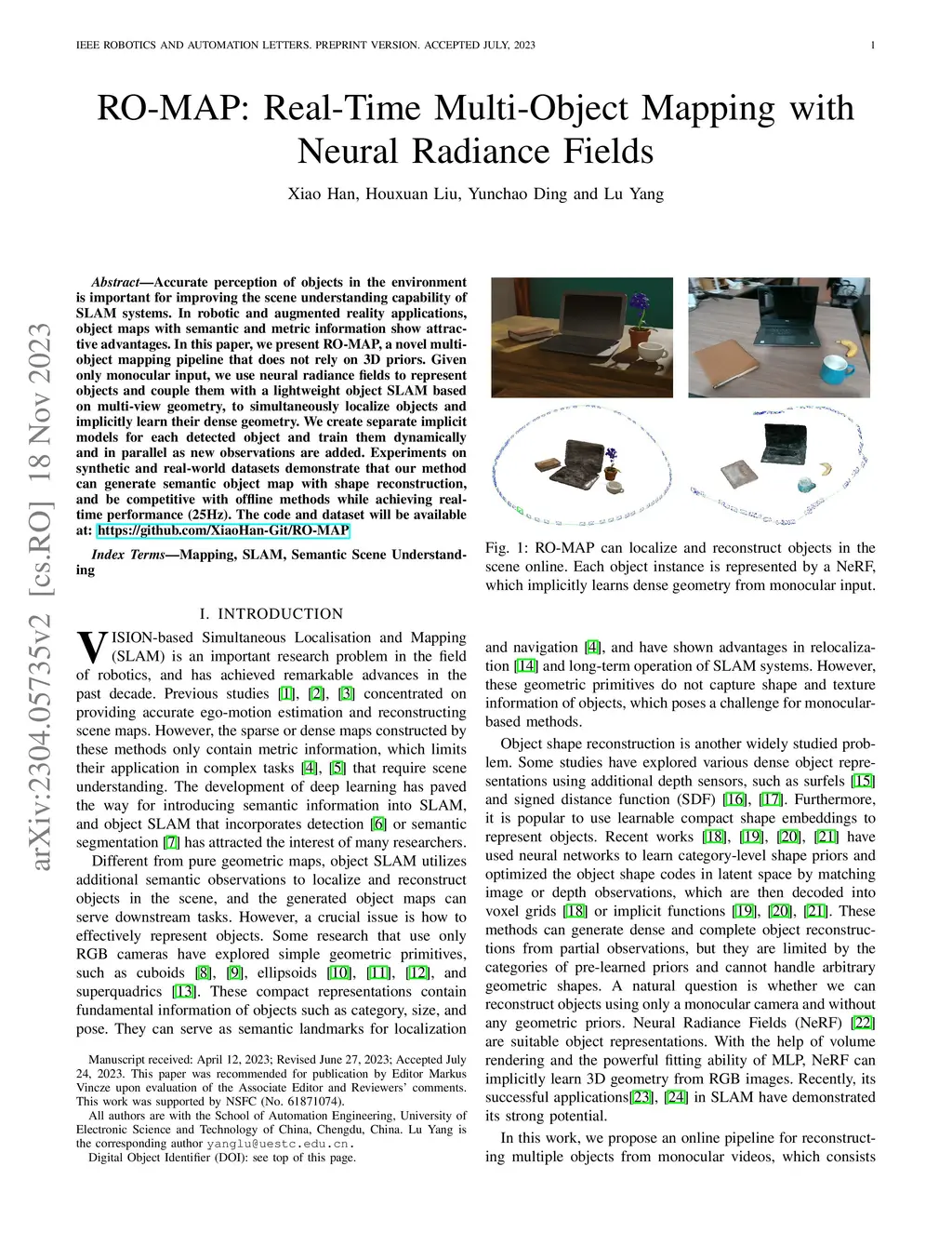 Accurate perception of objects in the environment is important for improving the scene understanding capability of SLAM systems. In robotic and augmented reality applications, object maps with semantic and metric information show attractive advantages. In this paper, we present RO-MAP, a novel multi-object mapping pipeline that does not rely on 3D priors. Given only monocular input, we use neural radiance fields to represent objects and couple them with a lightweight object SLAM based on multi-view geometry, to simultaneously localize objects and implicitly learn their dense geometry. We create separate implicit models for each detected object and train them dynamically and in parallel as new observations are added. Experiments on synthetic and real-world datasets demonstrate that our method can generate semantic object map with shape reconstruction, and be competitive with offline methods while achieving real-time performance (25Hz). The code and dataset will be available at: https://github.com/XiaoHan-Git/RO-MAP