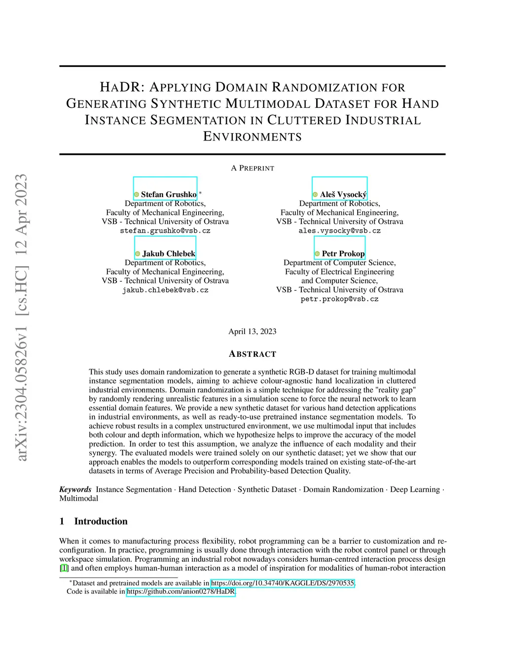 This study uses domain randomization to generate a synthetic RGB-D dataset for training multimodal instance segmentation models, aiming to achieve colour-agnostic hand localization in cluttered industrial environments. Domain randomization is a simple technique for addressing the "reality gap" by randomly rendering unrealistic features in a simulation scene to force the neural network to learn essential domain features. We provide a new synthetic dataset for various hand detection applications in industrial environments, as well as ready-to-use pretrained instance segmentation models. To achieve robust results in a complex unstructured environment, we use multimodal input that includes both colour and depth information, which we hypothesize helps to improve the accuracy of the model prediction. In order to test this assumption, we analyze the influence of each modality and their synergy. The evaluated models were trained solely on our synthetic dataset; yet we show that our approach enables the models to outperform corresponding models trained on existing state-of-the-art datasets in terms of Average Precision and Probability-based Detection Quality.