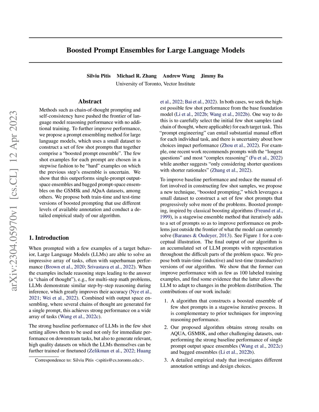 Methods such as chain-of-thought prompting and self-consistency have pushed the frontier of language model reasoning performance with no additional training. To further improve performance, we propose a prompt ensembling method for large language models, which uses a small dataset to construct a set of few shot prompts that together comprise a ``boosted prompt ensemble''. The few shot examples for each prompt are chosen in a stepwise fashion to be ``hard'' examples on which the previous step's ensemble is uncertain. We show that this outperforms single-prompt output-space ensembles and bagged prompt-space ensembles on the GSM8k and AQuA datasets, among others. We propose both train-time and test-time versions of boosted prompting that use different levels of available annotation and conduct a detailed empirical study of our algorithm.