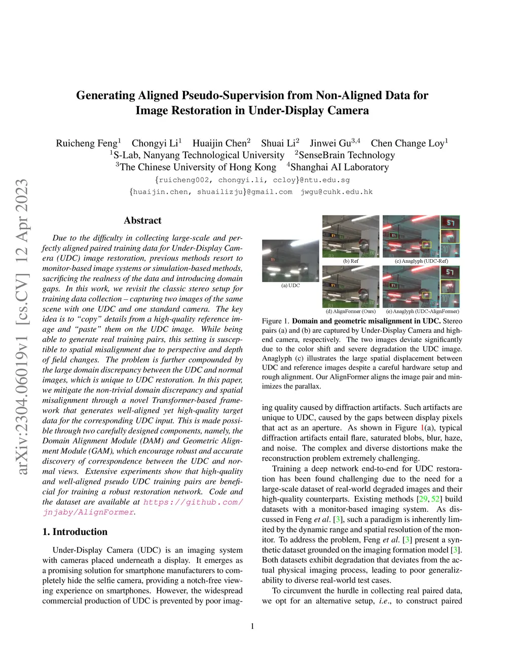 Due to the difficulty in collecting large-scale and perfectly aligned paired training data for Under-Display Camera (UDC) image restoration, previous methods resort to monitor-based image systems or simulation-based methods, sacrificing the realness of the data and introducing domain gaps. In this work, we revisit the classic stereo setup for training data collection -- capturing two images of the same scene with one UDC and one standard camera. The key idea is to "copy" details from a high-quality reference image and "paste" them on the UDC image. While being able to generate real training pairs, this setting is susceptible to spatial misalignment due to perspective and depth of field changes. The problem is further compounded by the large domain discrepancy between the UDC and normal images, which is unique to UDC restoration. In this paper, we mitigate the non-trivial domain discrepancy and spatial misalignment through a novel Transformer-based framework that generates well-aligned yet high-quality target data for the corresponding UDC input. This is made possible through two carefully designed components, namely, the Domain Alignment Module (DAM) and Geometric Alignment Module (GAM), which encourage robust and accurate discovery of correspondence between the UDC and normal views. Extensive experiments show that high-quality and well-aligned pseudo UDC training pairs are beneficial for training a robust restoration network. Code and the dataset are available at https://github.com/jnjaby/AlignFormer.