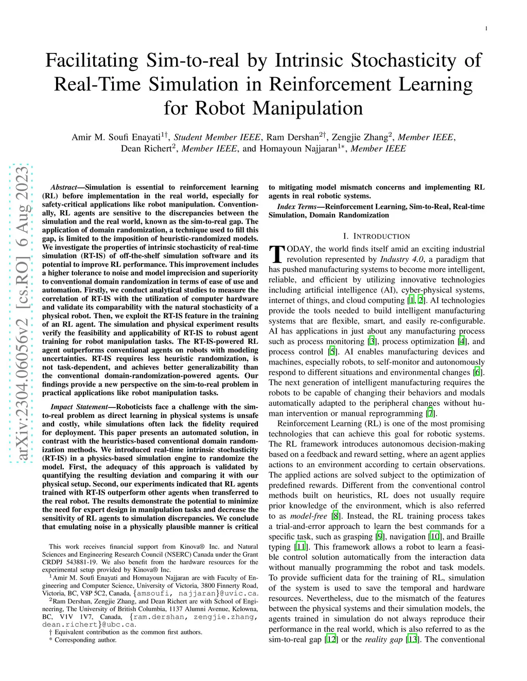 Simulation is essential to reinforcement learning (RL) before implementation in the real world, especially for safety-critical applications like robot manipulation. Conventionally, RL agents are sensitive to the discrepancies between the simulation and the real world, known as the sim-to-real gap. The application of domain randomization, a technique used to fill this gap, is limited to the imposition of heuristic-randomized models. {We investigate the properties of intrinsic stochasticity of real-time simulation (RT-IS) of off-the-shelf simulation software and its potential to improve RL performance. This improvement includes a higher tolerance to noise and model imprecision and superiority to conventional domain randomization in terms of ease of use and automation. Firstly, we conduct analytical studies to measure the correlation of RT-IS with the utilization of computer hardware and validate its comparability with the natural stochasticity of a physical robot. Then, we exploit the RT-IS feature in the training of an RL agent. The simulation and physical experiment results verify the feasibility and applicability of RT-IS to robust agent training for robot manipulation tasks. The RT-IS-powered RL agent outperforms conventional agents on robots with modeling uncertainties. RT-IS requires less heuristic randomization, is not task-dependent, and achieves better generalizability than the conventional domain-randomization-powered agents. Our findings provide a new perspective on the sim-to-real problem in practical applications like robot manipulation tasks.