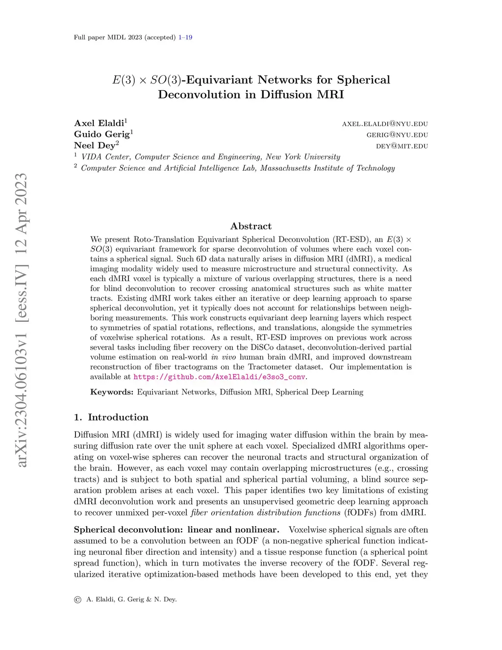 We present Roto-Translation Equivariant Spherical Deconvolution (RT-ESD), an equivariant framework for sparse deconvolution of volumes where each voxel contains a spherical signal. Such 6D data naturally arises in diffusion MRI (dMRI), a medical imaging modality widely used to measure microstructure and structural connectivity. As each dMRI voxel is typically a mixture of various overlapping structures, there is a need for blind deconvolution to recover crossing anatomical structures such as white matter tracts. Existing dMRI work takes either an iterative or deep learning approach to sparse spherical deconvolution, yet it typically does not account for relationships between neighboring measurements. This work constructs equivariant deep learning layers which respect to symmetries of spatial rotations, reflections, and translations, alongside the symmetries of voxelwise spherical rotations. As a result, RT-ESD improves on previous work across several tasks including fiber recovery on the DiSCo dataset, deconvolution-derived partial volume estimation on real-world \textit{in vivo} human brain dMRI, and improved downstream reconstruction of fiber tractograms on the Tractometer dataset. Our implementation is available at https://github.com/AxelElaldi/e3so3_conv