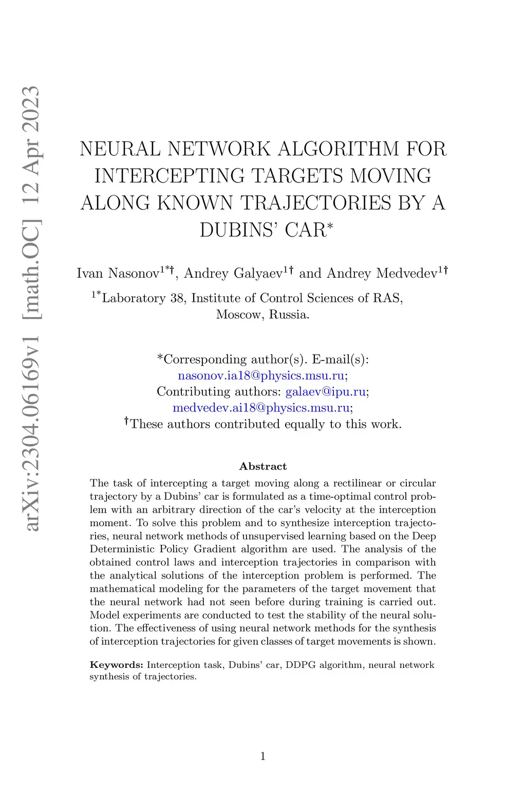 The task of intercepting a target moving along a rectilinear or circular trajectory by a Dubins' car is formulated as a time-optimal control problem with an arbitrary direction of the car's velocity at the interception moment. To solve this problem and to synthesize interception trajectories, neural network methods of unsupervised learning based on the Deep Deterministic Policy Gradient algorithm are used. The analysis of the obtained control laws and interception trajectories in comparison with the analytical solutions of the interception problem is performed. The mathematical modeling for the parameters of the target movement that the neural network had not seen before during training is carried out. Model experiments are conducted to test the stability of the neural solution. The effectiveness of using neural network methods for the synthesis of interception trajectories for given classes of target movements is shown.