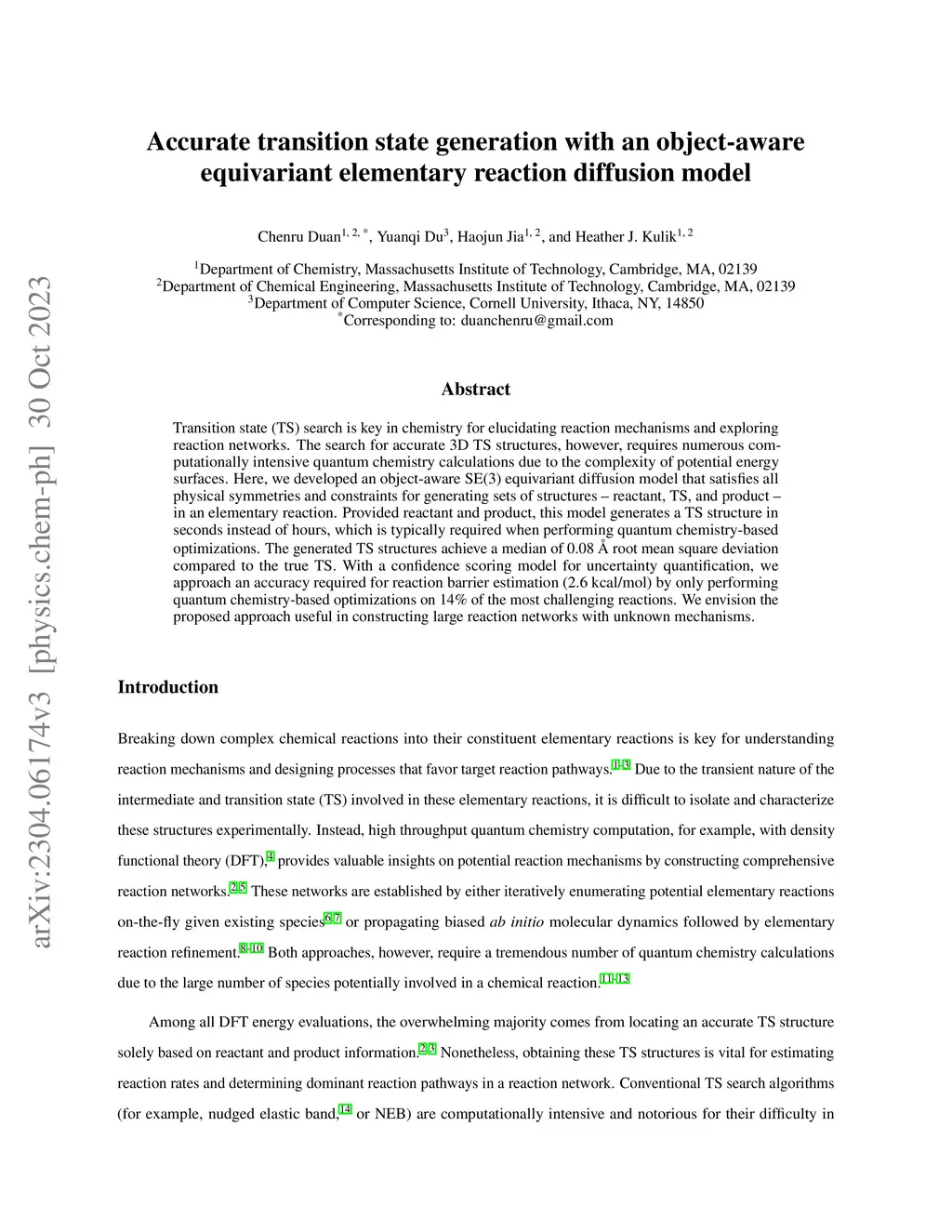 Transition state (TS) search is key in chemistry for elucidating reaction mechanisms and exploring reaction networks. The search for accurate 3D TS structures, however, requires numerous computationally intensive quantum chemistry calculations due to the complexity of potential energy surfaces. Here, we developed an object-aware SE(3) equivariant diffusion model that satisfies all physical symmetries and constraints for generating sets of structures - reactant, TS, and product - in an elementary reaction. Provided reactant and product, this model generates a TS structure in seconds instead of hours required when performing quantum chemistry-based optimizations. The generated TS structures achieve a median of 0.08 {\AA} root mean square deviation compared to the true TS. With a confidence scoring model for uncertainty quantification, we approach an accuracy required for reaction rate estimation (2.6 kcal/mol) by only performing quantum chemistry-based optimizations on 14\% of the most challenging reactions. We envision the proposed approach useful in constructing large reaction networks with unknown mechanisms.
