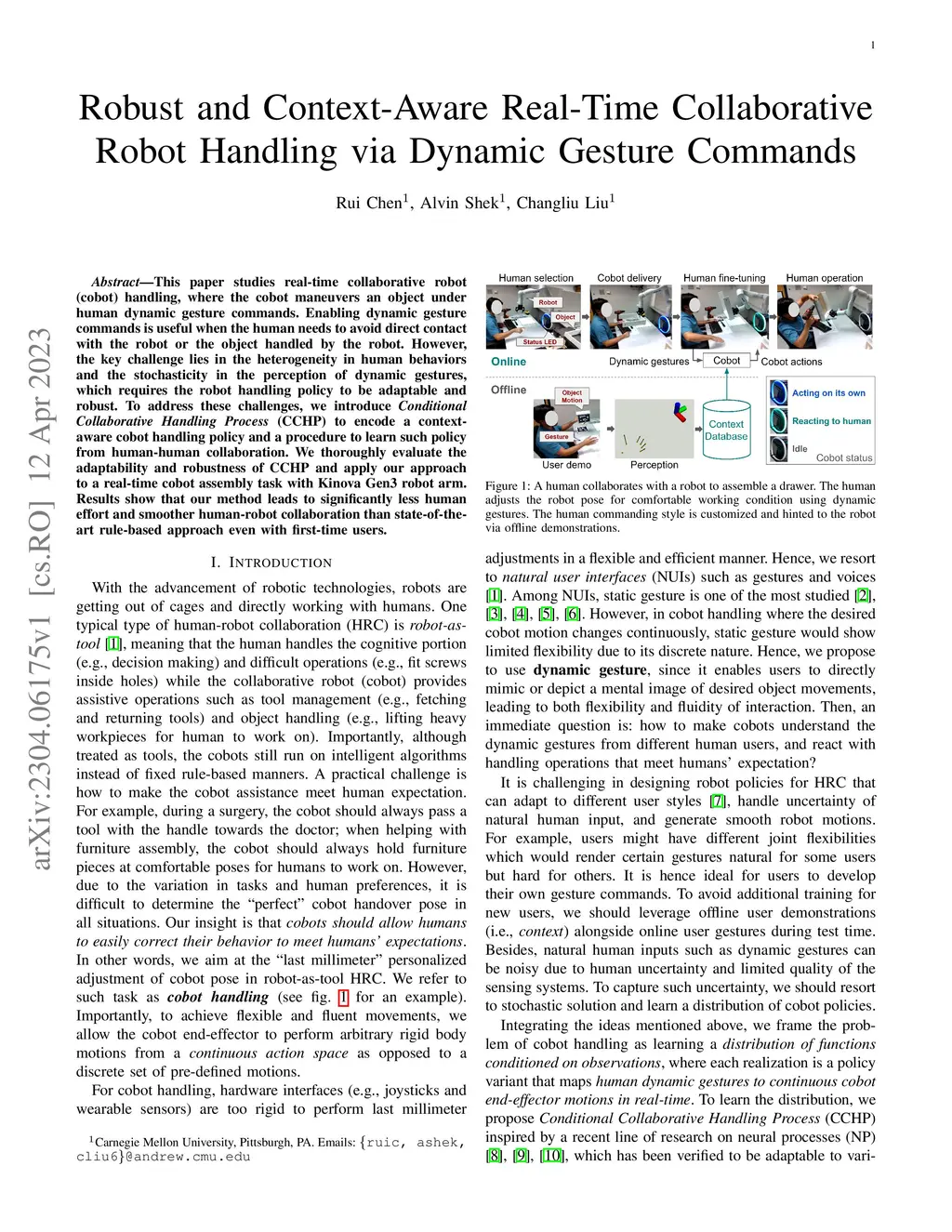 This paper studies real-time collaborative robot (cobot) handling, where the cobot maneuvers an object under human dynamic gesture commands. Enabling dynamic gesture commands is useful when the human needs to avoid direct contact with the robot or the object handled by the robot. However, the key challenge lies in the heterogeneity in human behaviors and the stochasticity in the perception of dynamic gestures, which requires the robot handling policy to be adaptable and robust. To address these challenges, we introduce Conditional Collaborative Handling Process (CCHP) to encode a contextaware cobot handling policy and a procedure to learn such policy from human-human collaboration. We thoroughly evaluate the adaptability and robustness of CCHP and apply our approach to a real-time cobot assembly task with Kinova Gen3 robot arm. Results show that our method leads to significantly less human effort and smoother human-robot collaboration than state-of-the-art rule-based approach even with first-time users.