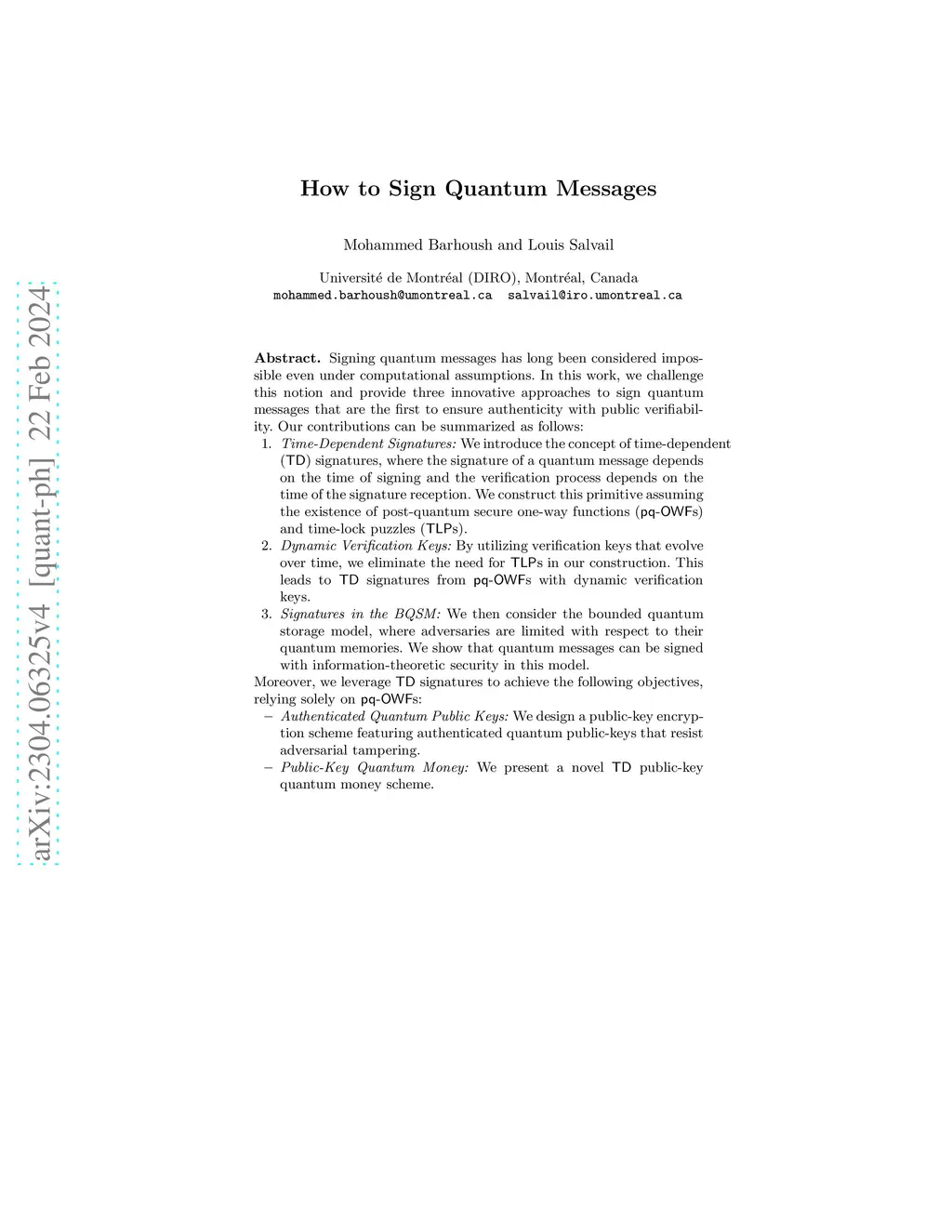 Signing quantum messages has long been considered impossible even under computational assumptions. In this work, we challenge this notion and provide three innovative approaches to sign quantum messages that are the first to ensure authenticity with public verifiability. Our contributions can be summarized as follows:1) We introduce the concept of time-dependent (TD) signatures, where the signature of a quantum message depends on the time of signing and the verification process depends on the time of the signature reception. We construct this primitive assuming the existence of post-quantum secure one-way functions (pq-OWFs) and time-lock puzzles (TLPs).2) By utilizing verification keys that evolve over time, we eliminate the need for TLPs in our construction. This leads to TD signatures from pq-OWFs with dynamic verification keys.3) We then consider the bounded quantum storage model, where adversaries are limited with respect to their quantum memories. We show that quantum messages can be signed with information-theoretic security in this model.Moreover, we leverage TD signatures to achieve the following objectives, relying solely on pq-OWFs: (a) We design a public key encryption scheme featuring authenticated quantum public keys that resist adversarial tampering. (b) We present a novel TD public-key quantum money scheme.