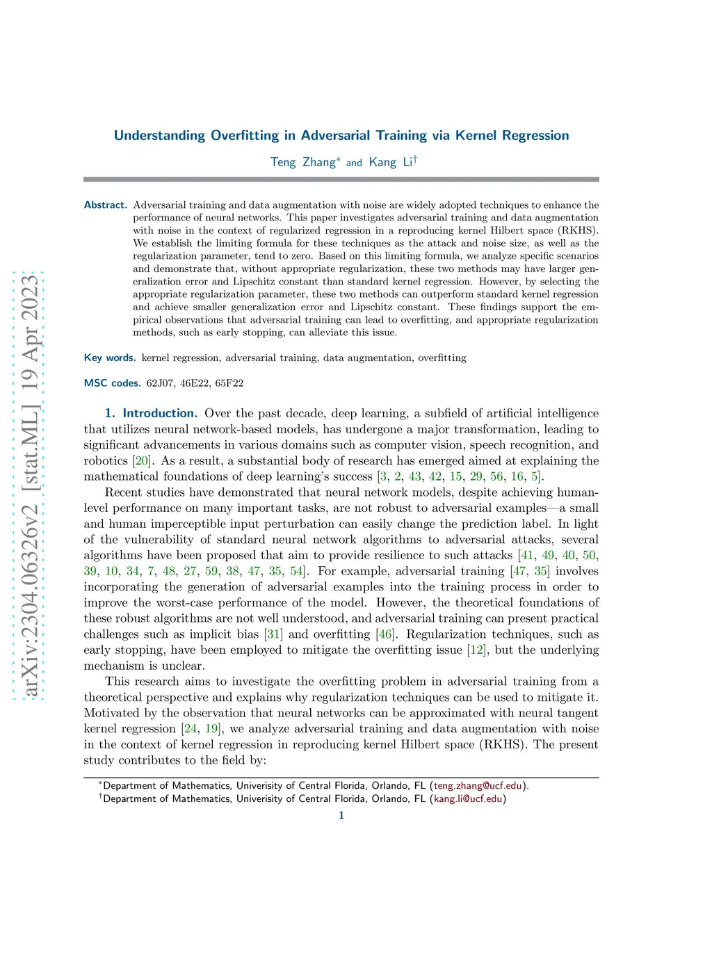 Adversarial training and data augmentation with noise are widely adopted techniques to enhance the performance of neural networks. This paper investigates adversarial training and data augmentation with noise in the context of regularized regression in a reproducing kernel Hilbert space (RKHS). We establish the limiting formula for these techniques as the attack and noise size, as well as the regularization parameter, tend to zero. Based on this limiting formula, we analyze specific scenarios and demonstrate that, without appropriate regularization, these two methods may have larger generalization error and Lipschitz constant than standard kernel regression. However, by selecting the appropriate regularization parameter, these two methods can outperform standard kernel regression and achieve smaller generalization error and Lipschitz constant. These findings support the empirical observations that adversarial training can lead to overfitting, and appropriate regularization methods, such as early stopping, can alleviate this issue.