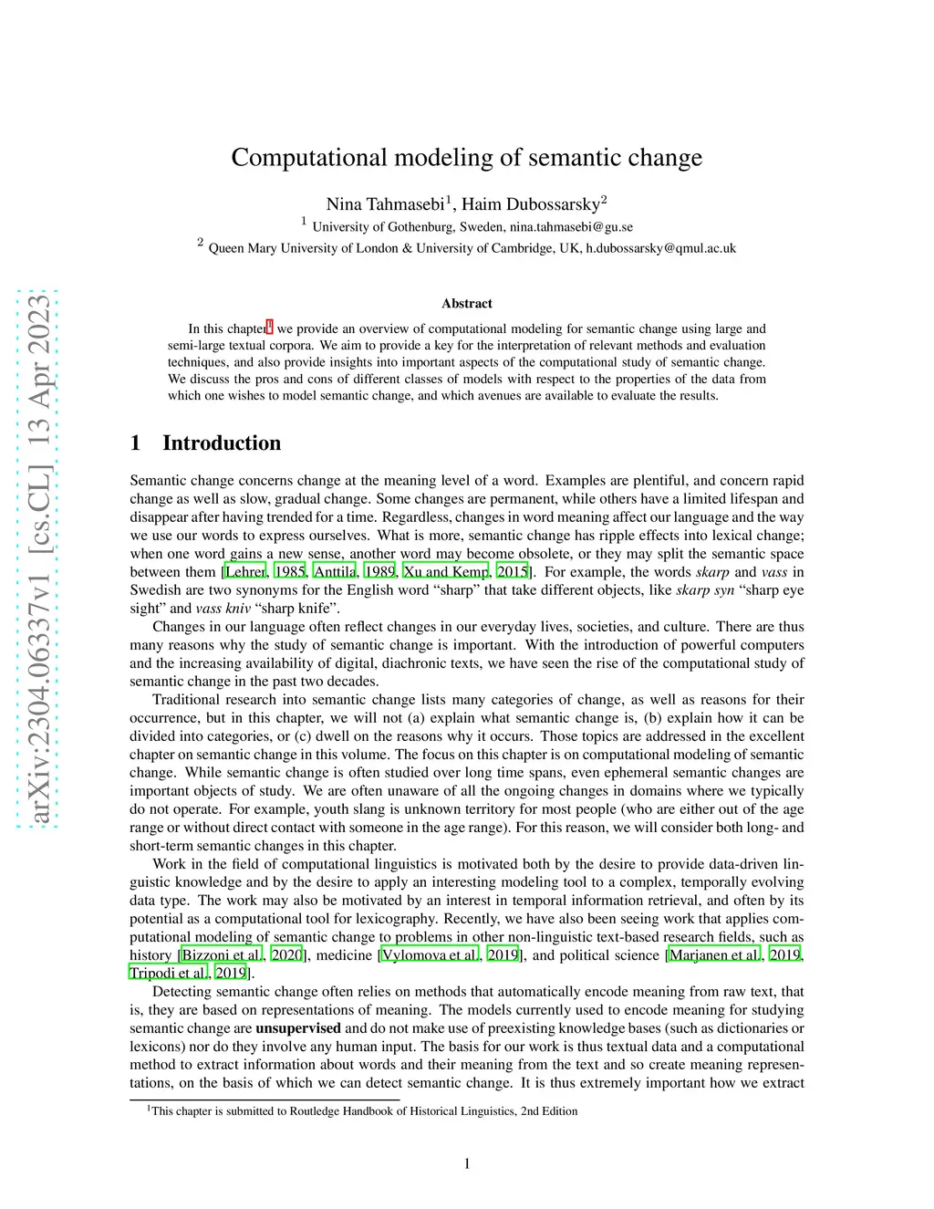 In this chapter we provide an overview of computational modeling for semantic change using large and semi-large textual corpora. We aim to provide a key for the interpretation of relevant methods and evaluation techniques, and also provide insights into important aspects of the computational study of semantic change. We discuss the pros and cons of different classes of models with respect to the properties of the data from which one wishes to model semantic change, and which avenues are available to evaluate the results.