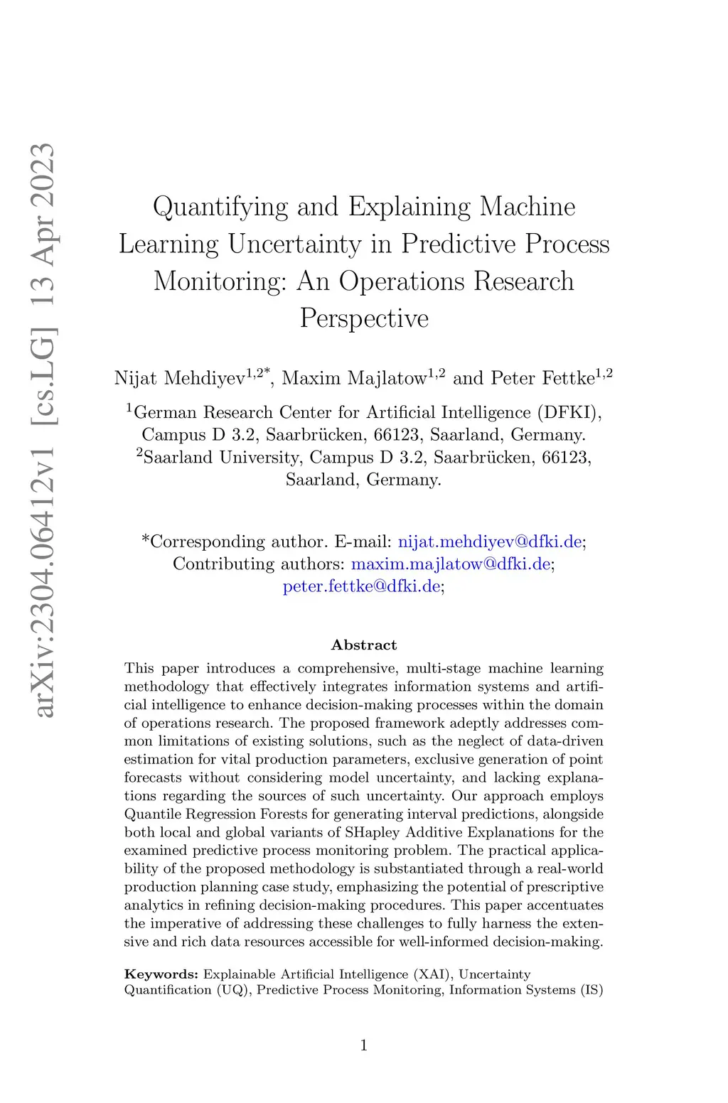 This paper introduces a comprehensive, multi-stage machine learning methodology that effectively integrates information systems and artificial intelligence to enhance decision-making processes within the domain of operations research. The proposed framework adeptly addresses common limitations of existing solutions, such as the neglect of data-driven estimation for vital production parameters, exclusive generation of point forecasts without considering model uncertainty, and lacking explanations regarding the sources of such uncertainty. Our approach employs Quantile Regression Forests for generating interval predictions, alongside both local and global variants of SHapley Additive Explanations for the examined predictive process monitoring problem. The practical applicability of the proposed methodology is substantiated through a real-world production planning case study, emphasizing the potential of prescriptive analytics in refining decision-making procedures. This paper accentuates the imperative of addressing these challenges to fully harness the extensive and rich data resources accessible for well-informed decision-making.