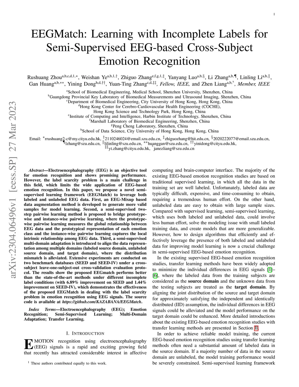 Electroencephalography (EEG) is an objective tool for emotion recognition and shows promising performance. However, the label scarcity problem is a main challenge in this field, which limits the wide application of EEG-based emotion recognition. In this paper, we propose a novel semi-supervised learning framework (EEGMatch) to leverage both labeled and unlabeled EEG data. First, an EEG-Mixup based data augmentation method is developed to generate more valid samples for model learning. Second, a semi-supervised two-step pairwise learning method is proposed to bridge prototype-wise and instance-wise pairwise learning, where the prototype-wise pairwise learning measures the global relationship between EEG data and the prototypical representation of each emotion class and the instance-wise pairwise learning captures the local intrinsic relationship among EEG data. Third, a semi-supervised multi-domain adaptation is introduced to align the data representation among multiple domains (labeled source domain, unlabeled source domain, and target domain), where the distribution mismatch is alleviated. Extensive experiments are conducted on two benchmark databases (SEED and SEED-IV) under a cross-subject leave-one-subject-out cross-validation evaluation protocol. The results show the proposed EEGmatch performs better than the state-of-the-art methods under different incomplete label conditions (with 6.89% improvement on SEED and 1.44% improvement on SEED-IV), which demonstrates the effectiveness of the proposed EEGMatch in dealing with the label scarcity problem in emotion recognition using EEG signals. The source code is available at https://github.com/KAZABANA/EEGMatch.