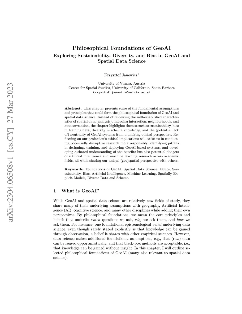 This chapter presents some of the fundamental assumptions and principles that could form the philosophical foundation of GeoAI and spatial data science. Instead of reviewing the well-established characteristics of spatial data (analysis), including interaction, neighborhoods, and autocorrelation, the chapter highlights themes such as sustainability, bias in training data, diversity in schema knowledge, and the (potential lack of) neutrality of GeoAI systems from a unifying ethical perspective. Reflecting on our profession's ethical implications will assist us in conducting potentially disruptive research more responsibly, identifying pitfalls in designing, training, and deploying GeoAI-based systems, and developing a shared understanding of the benefits but also potential dangers of artificial intelligence and machine learning research across academic fields, all while sharing our unique (geo)spatial perspective with others.