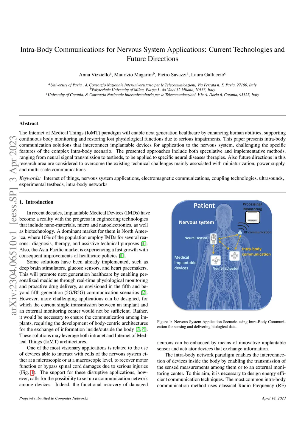 The Internet of Medical Things (IoMT) paradigm will enable next generation healthcare by enhancing human abilities, supporting continuous body monitoring and restoring lost physiological functions due to serious impairments. This paper presents intra-body communication solutions that interconnect implantable devices for application to the nervous system, challenging the specific features of the complex intra-body scenario. The presented approaches include both speculative and implementative methods, ranging from neural signal transmission to testbeds, to be applied to specific neural diseases therapies. Also future directions in this research area are considered to overcome the existing technical challenges mainly associated with miniaturization, power supply, and multi-scale communications.