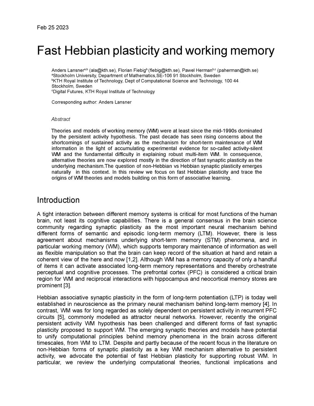 Theories and models of working memory (WM) were at least since the mid-1990s dominated by the persistent activity hypothesis. The past decade has seen rising concerns about the shortcomings of sustained activity as the mechanism for short-term maintenance of WM information in the light of accumulating experimental evidence for so-called activity-silent WM and the fundamental difficulty in explaining robust multi-item WM. In consequence, alternative theories are now explored mostly in the direction of fast synaptic plasticity as the underlying mechanism.The question of non-Hebbian vs Hebbian synaptic plasticity emerges naturally in this context. In this review we focus on fast Hebbian plasticity and trace the origins of WM theories and models building on this form of associative learning.