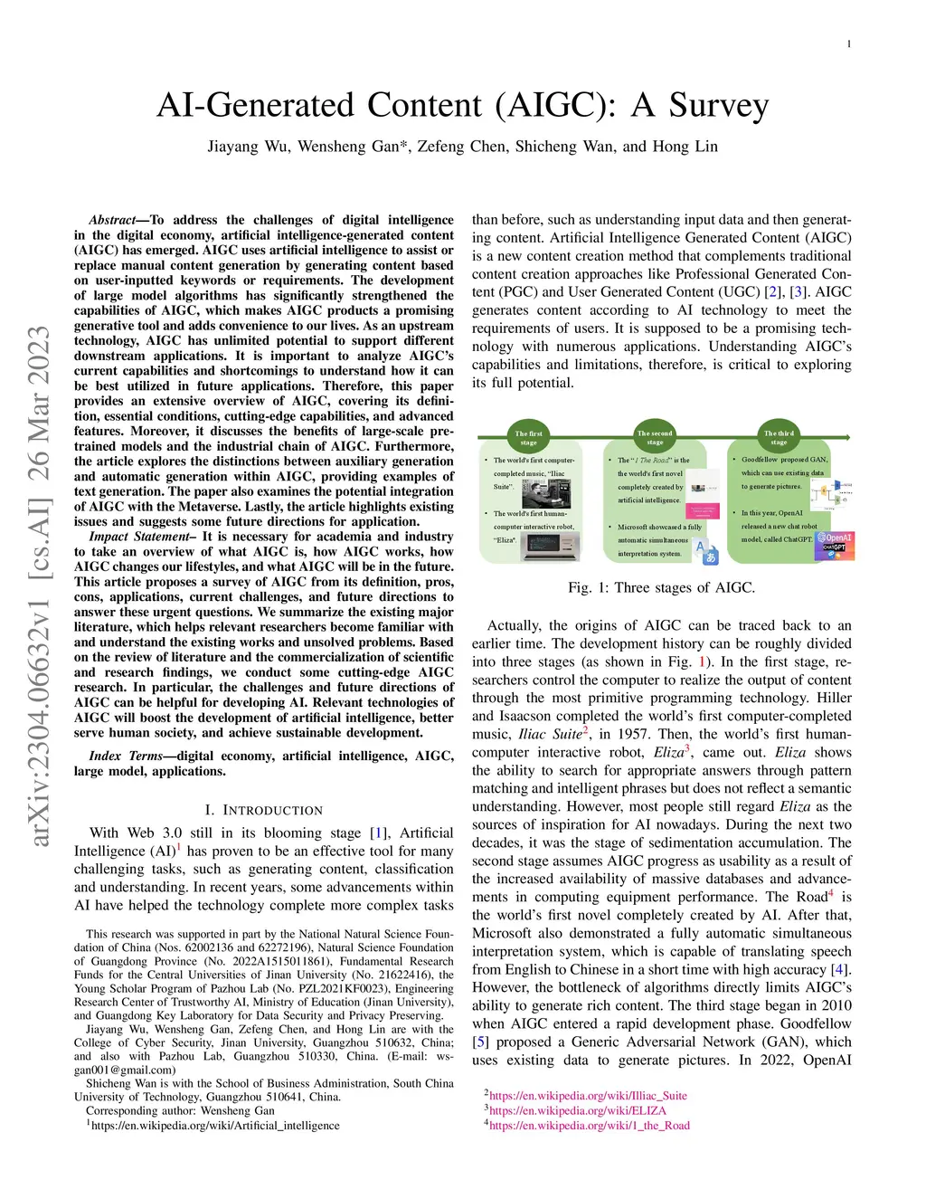 To address the challenges of digital intelligence in the digital economy, artificial intelligence-generated content (AIGC) has emerged. AIGC uses artificial intelligence to assist or replace manual content generation by generating content based on user-inputted keywords or requirements. The development of large model algorithms has significantly strengthened the capabilities of AIGC, which makes AIGC products a promising generative tool and adds convenience to our lives. As an upstream technology, AIGC has unlimited potential to support different downstream applications. It is important to analyze AIGC's current capabilities and shortcomings to understand how it can be best utilized in future applications. Therefore, this paper provides an extensive overview of AIGC, covering its definition, essential conditions, cutting-edge capabilities, and advanced features. Moreover, it discusses the benefits of large-scale pre-trained models and the industrial chain of AIGC. Furthermore, the article explores the distinctions between auxiliary generation and automatic generation within AIGC, providing examples of text generation. The paper also examines the potential integration of AIGC with the Metaverse. Lastly, the article highlights existing issues and suggests some future directions for application.