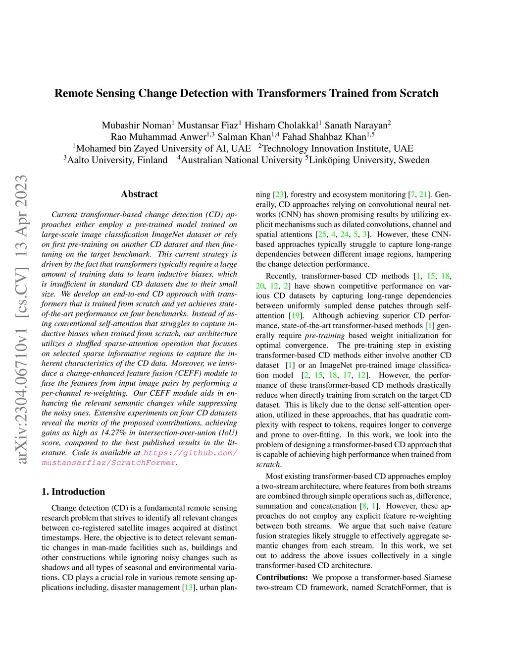 Current transformer-based change detection (CD) approaches either employ a pre-trained model trained on large-scale image classification ImageNet dataset or rely on first pre-training on another CD dataset and then fine-tuning on the target benchmark. This current strategy is driven by the fact that transformers typically require a large amount of training data to learn inductive biases, which is insufficient in standard CD datasets due to their small size. We develop an end-to-end CD approach with transformers that is trained from scratch and yet achieves state-of-the-art performance on four public benchmarks. Instead of using conventional self-attention that struggles to capture inductive biases when trained from scratch, our architecture utilizes a shuffled sparse-attention operation that focuses on selected sparse informative regions to capture the inherent characteristics of the CD data. Moreover, we introduce a change-enhanced feature fusion (CEFF) module to fuse the features from input image pairs by performing a per-channel re-weighting. Our CEFF module aids in enhancing the relevant semantic changes while suppressing the noisy ones. Extensive experiments on four CD datasets reveal the merits of the proposed contributions, achieving gains as high as 14.27\% in intersection-over-union (IoU) score, compared to the best-published results in the literature. Code is available at \url{https://github.com/mustansarfiaz/ScratchFormer}.