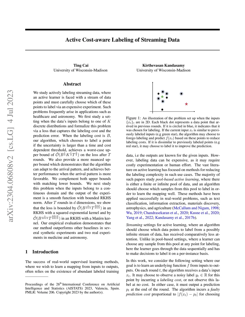 We study actively labeling streaming data, where an active learner is faced with a stream of data points and must carefully choose which of these points to label via an expensive experiment. Such problems frequently arise in applications such as healthcare and astronomy. We first study a setting when the data's inputs belong to one of discrete distributions and formalize this problem via a loss that captures the labeling cost and the prediction error. When the labeling cost is , our algorithm, which chooses to label a point if the uncertainty is larger than a time and cost dependent threshold, achieves a worst-case upper bound of on the loss after rounds. We also provide a more nuanced upper bound which demonstrates that the algorithm can adapt to the arrival pattern, and achieves better performance when the arrival pattern is more favorable. We complement both upper bounds with matching lower bounds. We next study this problem when the inputs belong to a continuous domain and the output of the experiment is a smooth function with bounded RKHS norm. After rounds in dimensions, we show that the loss is bounded by in an RKHS with a squared exponential kernel and by in an RKHS with a Mat\érn kernel. Our empirical evaluation demonstrates that our method outperforms other baselines in several synthetic experiments and two real experiments in medicine and astronomy.
