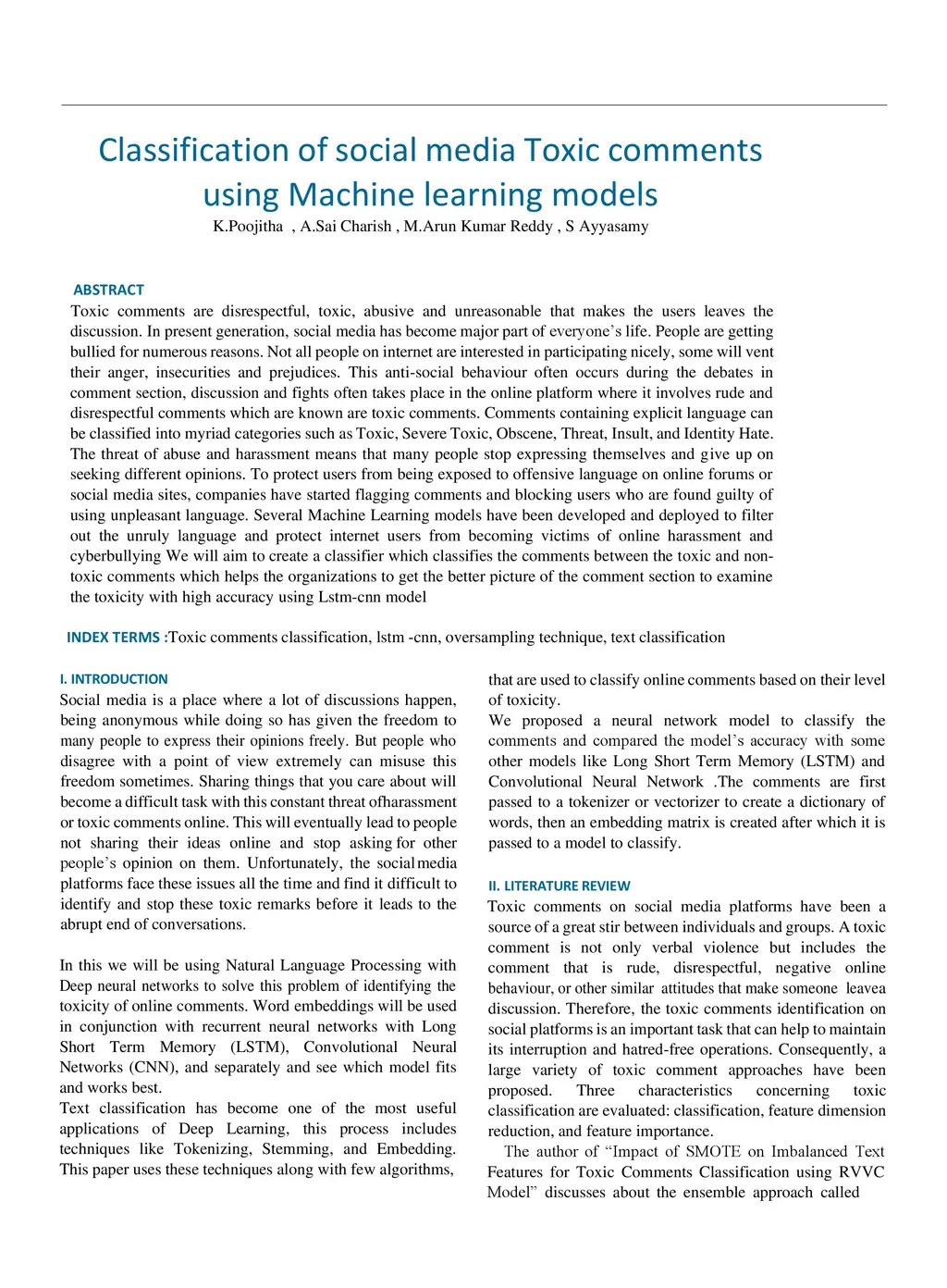 The abstract outlines the problem of toxic comments on social media platforms, where individuals use disrespectful, abusive, and unreasonable language that can drive users away from discussions. This behavior is referred to as anti-social behavior, which occurs during online debates, comments, and fights. The comments containing explicit language can be classified into various categories, such as toxic, severe toxic, obscene, threat, insult, and identity hate. This behavior leads to online harassment and cyberbullying, which forces individuals to stop expressing their opinions and ideas. To protect users from offensive language, companies have started flagging comments and blocking users. The abstract proposes to create a classifier using an Lstm-cnn model that can differentiate between toxic and non-toxic comments with high accuracy. The classifier can help organizations examine the toxicity of the comment section better.