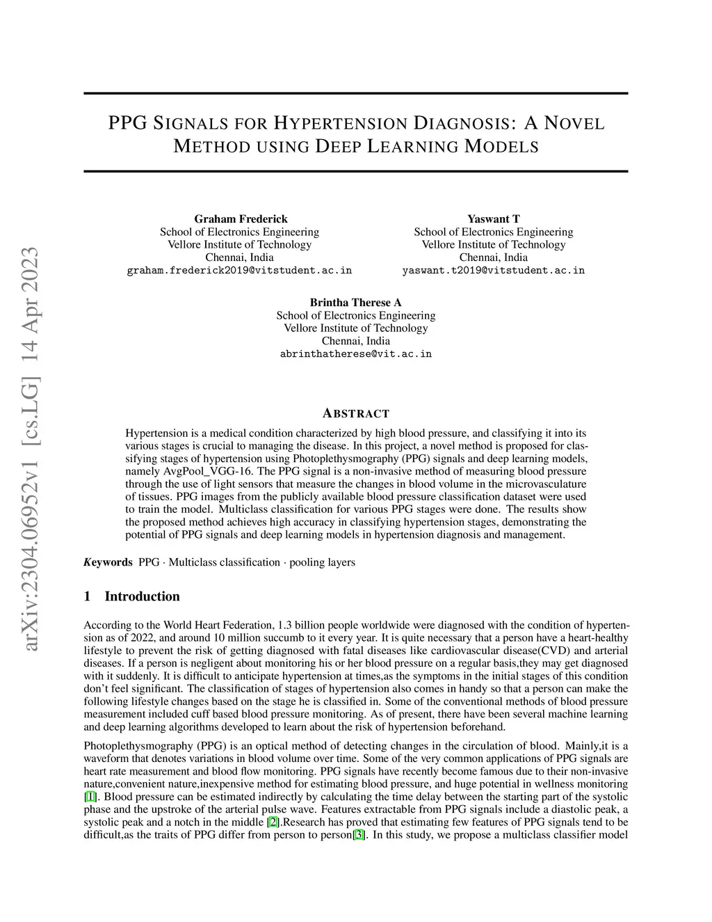 Hypertension is a medical condition characterized by high blood pressure, and classifying it into its various stages is crucial to managing the disease. In this project, a novel method is proposed for classifying stages of hypertension using Photoplethysmography (PPG) signals and deep learning models, namely AvgPool_VGG-16. The PPG signal is a non-invasive method of measuring blood pressure through the use of light sensors that measure the changes in blood volume in the microvasculature of tissues. PPG images from the publicly available blood pressure classification dataset were used to train the model. Multiclass classification for various PPG stages were done. The results show the proposed method achieves high accuracy in classifying hypertension stages, demonstrating the potential of PPG signals and deep learning models in hypertension diagnosis and management.