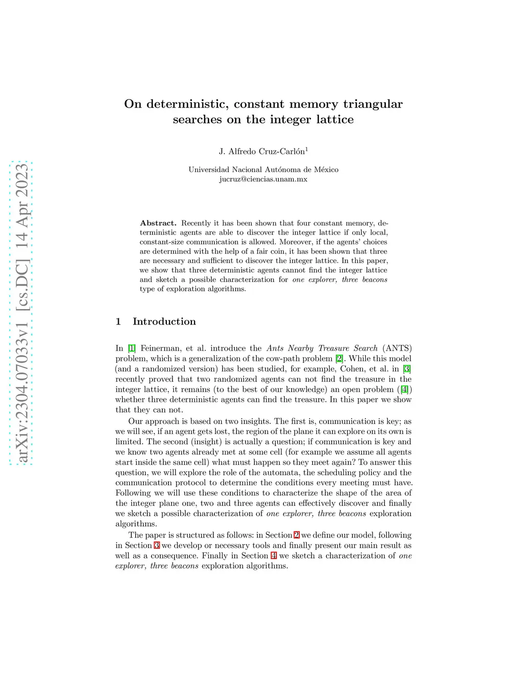 Recently it has been shown that four constant memory, deterministic agents are able to discover the integer lattice if only local, constant-size communication is allowed. Moreover, if the agents' choices are determined with the help of a fair coin, it has been shown that three are necessary and sufficient to discover the integer lattice. In this paper, we show that three deterministic agents cannot find the integer lattice and sketch a possible characterization for one explorer, three beacons type of exploration algorithm.
