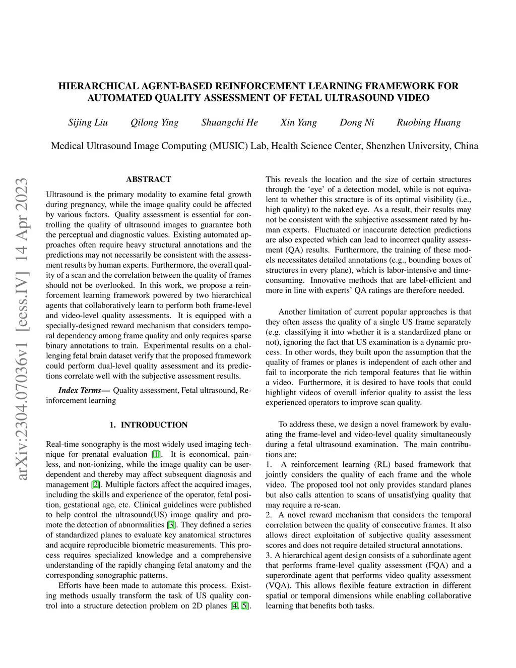 Ultrasound is the primary modality to examine fetal growth during pregnancy, while the image quality could be affected by various factors. Quality assessment is essential for controlling the quality of ultrasound images to guarantee both the perceptual and diagnostic values. Existing automated approaches often require heavy structural annotations and the predictions may not necessarily be consistent with the assessment results by human experts. Furthermore, the overall quality of a scan and the correlation between the quality of frames should not be overlooked. In this work, we propose a reinforcement learning framework powered by two hierarchical agents that collaboratively learn to perform both frame-level and video-level quality assessments. It is equipped with a specially-designed reward mechanism that considers temporal dependency among frame quality and only requires sparse binary annotations to train. Experimental results on a challenging fetal brain dataset verify that the proposed framework could perform dual-level quality assessment and its predictions correlate well with the subjective assessment results.