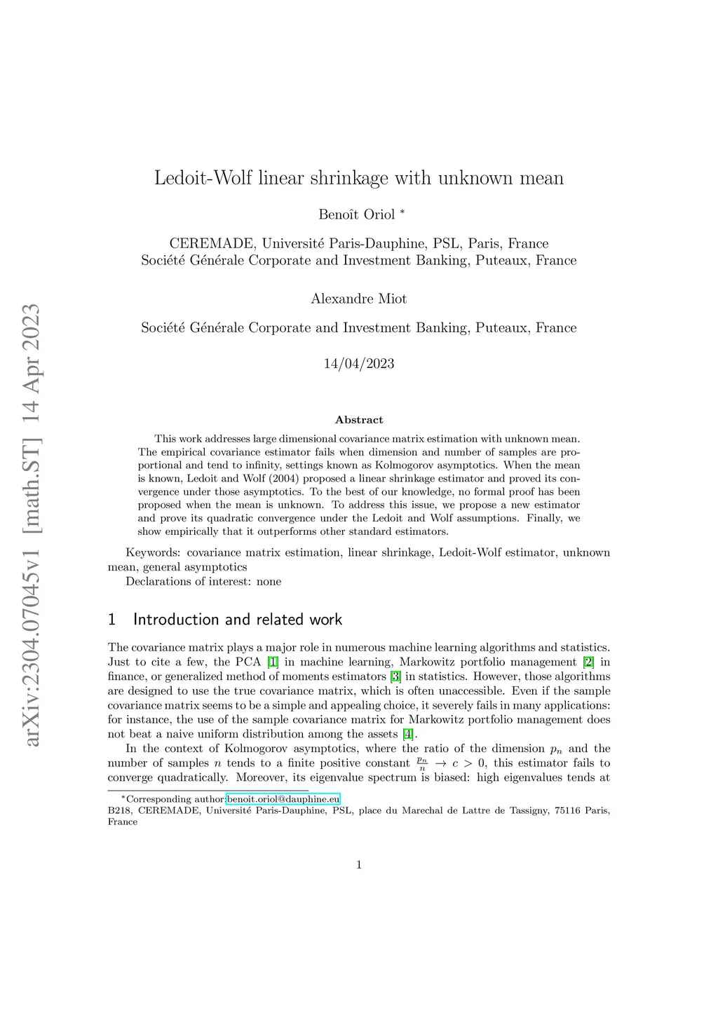 This work addresses large dimensional covariance matrix estimation with unknown mean. The empirical covariance estimator fails when dimension and number of samples are proportional and tend to infinity, settings known as Kolmogorov asymptotics. When the mean is known, Ledoit and Wolf (2004) proposed a linear shrinkage estimator and proved its convergence under those asymptotics. To the best of our knowledge, no formal proof has been proposed when the mean is unknown. To address this issue, we propose to extend the linear shrinkage and its convergence properties to translation-invariant estimators. We expose four estimators respecting those conditions, proving their properties. Finally, we show empirically that a new estimator we propose outperforms other standard estimators.