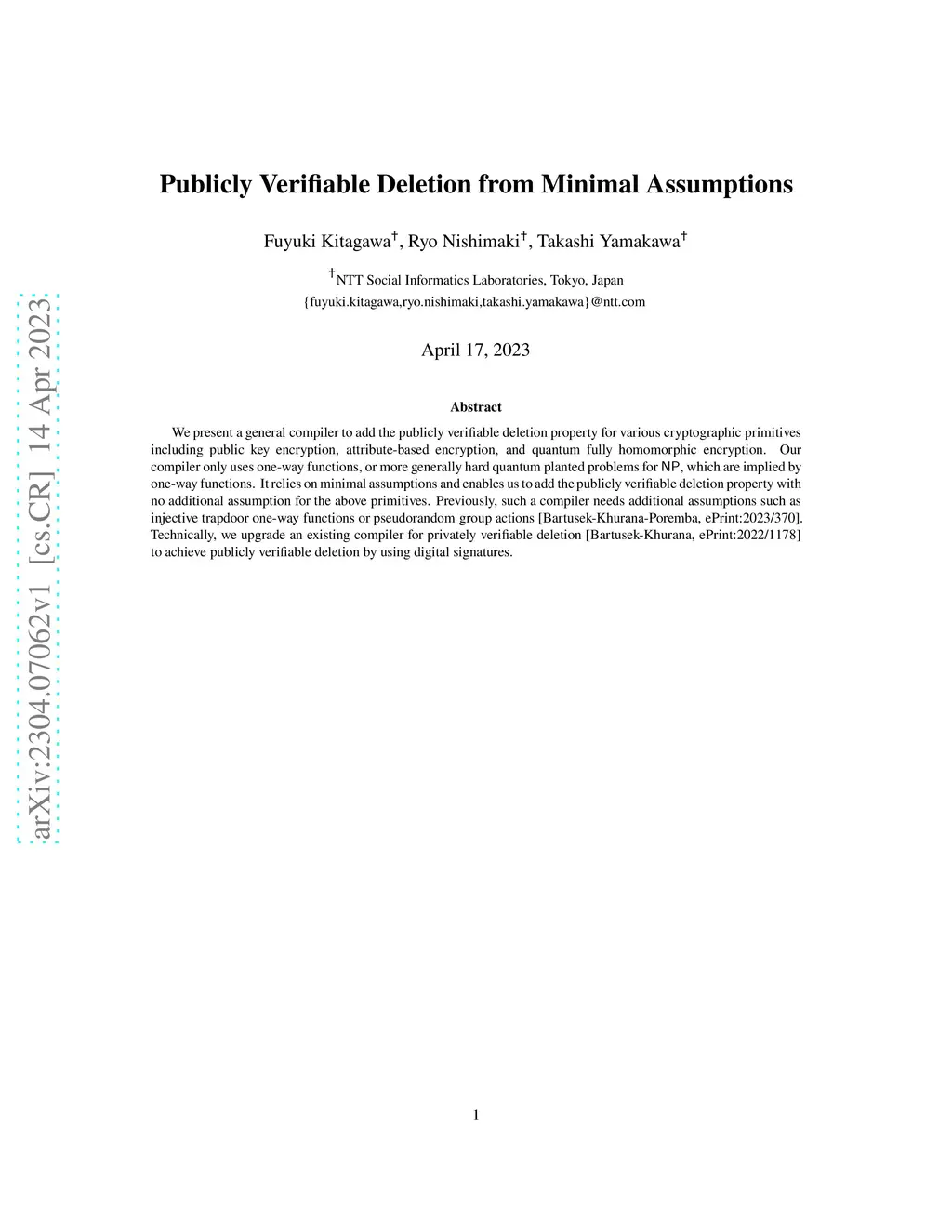 We present a general compiler to add the publicly verifiable deletion property for various cryptographic primitives including public key encryption, attribute-based encryption, and quantum fully homomorphic encryption. Our compiler only uses one-way functions, or more generally hard quantum planted problems for NP, which are implied by one-way functions. It relies on minimal assumptions and enables us to add the publicly verifiable deletion property with no additional assumption for the above primitives. Previously, such a compiler needs additional assumptions such as injective trapdoor one-way functions or pseudorandom group actions [Bartusek-Khurana-Poremba, ePrint:2023/370]. Technically, we upgrade an existing compiler for privately verifiable deletion [Bartusek-Khurana, ePrint:2022/1178] to achieve publicly verifiable deletion by using digital signatures.