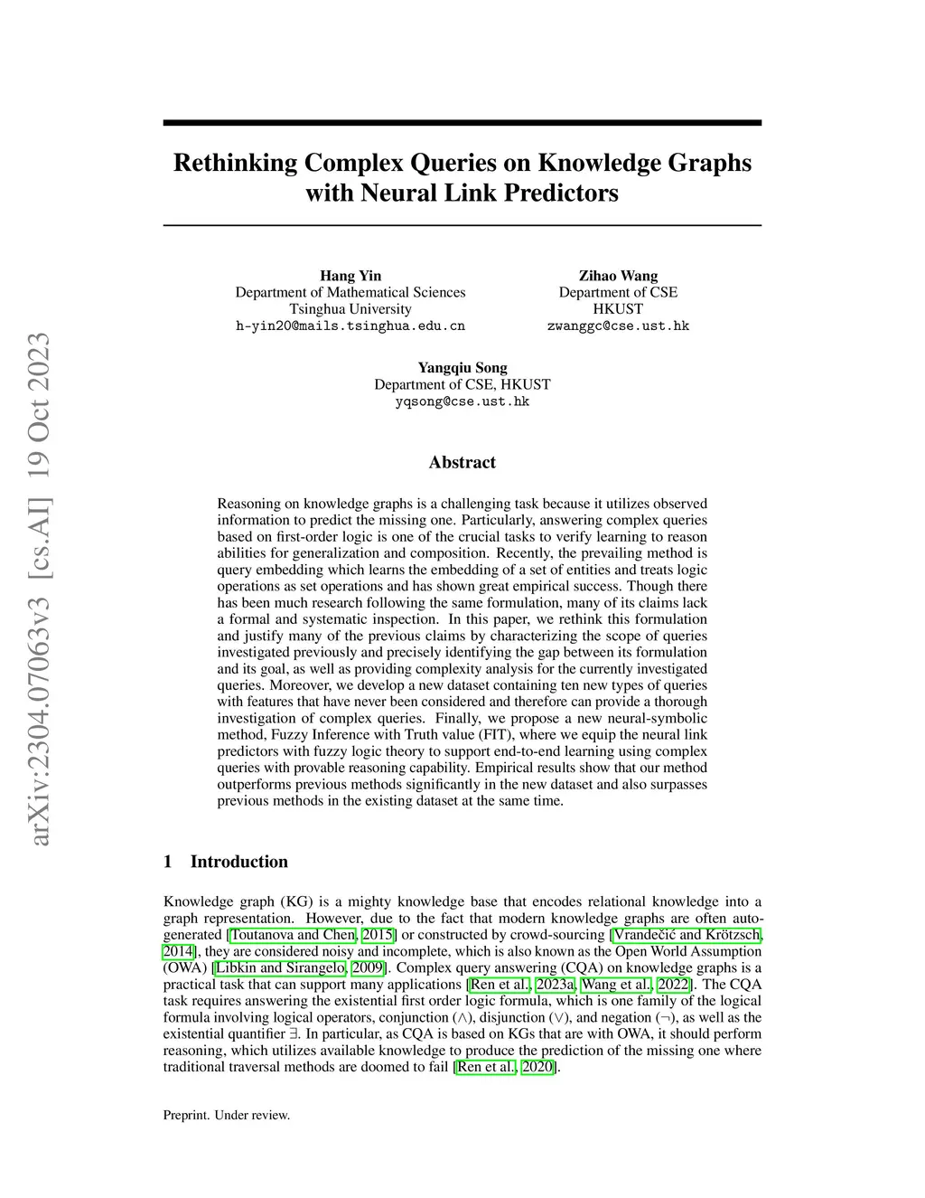 Reasoning on knowledge graphs is a challenging task because it utilizes observed information to predict the missing one. Particularly, answering complex queries based on first-order logic is one of the crucial tasks to verify learning to reason abilities for generalization and composition. Recently, the prevailing method is query embedding which learns the embedding of a set of entities and treats logic operations as set operations and has shown great empirical success. Though there has been much research following the same formulation, many of its claims lack a formal and systematic inspection. In this paper, we rethink this formulation and justify many of the previous claims by characterizing the scope of queries investigated previously and precisely identifying the gap between its formulation and its goal, as well as providing complexity analysis for the currently investigated queries. Moreover, we develop a new dataset containing ten new types of queries with features that have never been considered and therefore can provide a thorough investigation of complex queries. Finally, we propose a new neural-symbolic method, Fuzzy Inference with Truth value (FIT), where we equip the neural link predictors with fuzzy logic theory to support end-to-end learning using complex queries with provable reasoning capability. Empirical results show that our method outperforms previous methods significantly in the new dataset and also surpasses previous methods in the existing dataset at the same time.