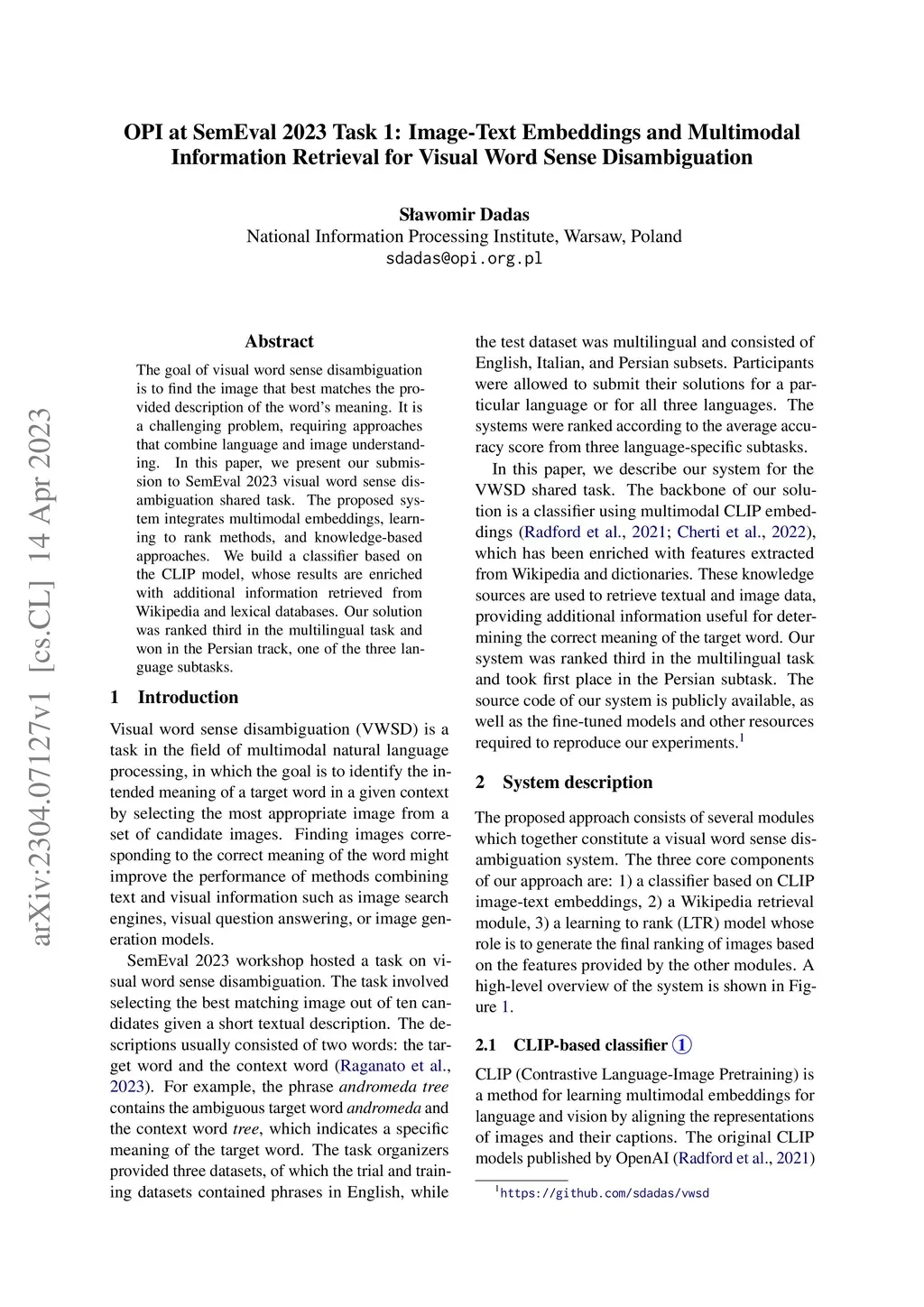 The goal of visual word sense disambiguation is to find the image that best matches the provided description of the word's meaning. It is a challenging problem, requiring approaches that combine language and image understanding. In this paper, we present our submission to SemEval 2023 visual word sense disambiguation shared task. The proposed system integrates multimodal embeddings, learning to rank methods, and knowledge-based approaches. We build a classifier based on the CLIP model, whose results are enriched with additional information retrieved from Wikipedia and lexical databases. Our solution was ranked third in the multilingual task and won in the Persian track, one of the three language subtasks.