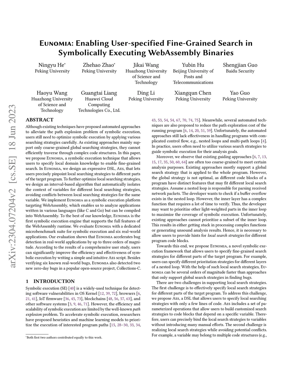 Although existing techniques have proposed automated approaches to alleviate the path explosion problem of symbolic execution, users still need to optimize symbolic execution by applying various searching strategies carefully. As existing approaches mainly support only coarse-grained global searching strategies, they cannot efficiently traverse through complex code structures. In this paper, we propose Eunomia, a symbolic execution technique that allows users to specify local domain knowledge to enable fine-grained search. In Eunomia, we design an expressive DSL, Aes, that lets users precisely pinpoint local searching strategies to different parts of the target program. To further optimize local searching strategies, we design an interval-based algorithm that automatically isolates the context of variables for different local searching strategies, avoiding conflicts between local searching strategies for the same variable. We implement Eunomia as a symbolic execution platform targeting WebAssembly, which enables us to analyze applications written in various languages (like C and Go) but can be compiled into WebAssembly. To the best of our knowledge, Eunomia is the first symbolic execution engine that supports the full features of the WebAssembly runtime. We evaluate Eunomia with a dedicated microbenchmark suite for symbolic execution and six real-world applications. Our evaluation shows that Eunomia accelerates bug detection in real-world applications by up to three orders of magnitude. According to the results of a comprehensive user study, users can significantly improve the efficiency and effectiveness of symbolic execution by writing a simple and intuitive Aes script. Besides verifying six known real-world bugs, Eunomia also detected two new zero-day bugs in a popular open-source project, Collections-C.