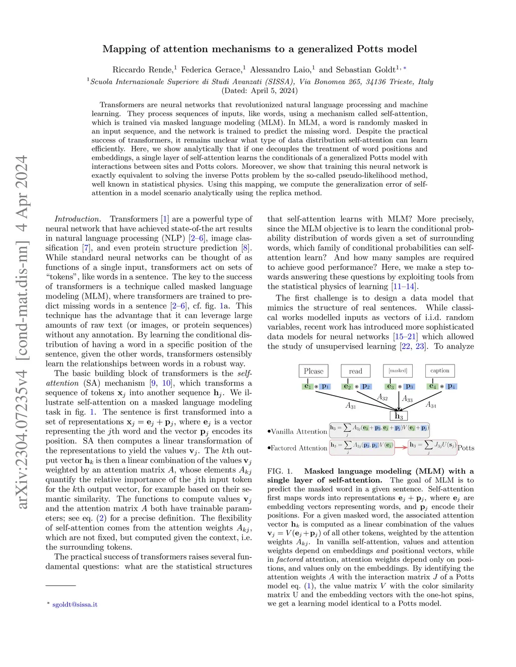 Transformers are neural networks that revolutionized natural language processing and machine learning. They process sequences of inputs, like words, using a mechanism called self-attention, which is trained via masked language modeling (MLM). In MLM, a word is randomly masked in an input sequence, and the network is trained to predict the missing word. Despite the practical success of transformers, it remains unclear what type of data distribution self-attention can learn efficiently. Here, we show analytically that if one decouples the treatment of word positions and embeddings, a single layer of self-attention learns the conditionals of a generalized Potts model with interactions between sites and Potts colors. Moreover, we show that training this neural network is exactly equivalent to solving the inverse Potts problem by the so-called pseudo-likelihood method, well known in statistical physics. Using this mapping, we compute the generalization error of self-attention in a model scenario analytically using the replica method.