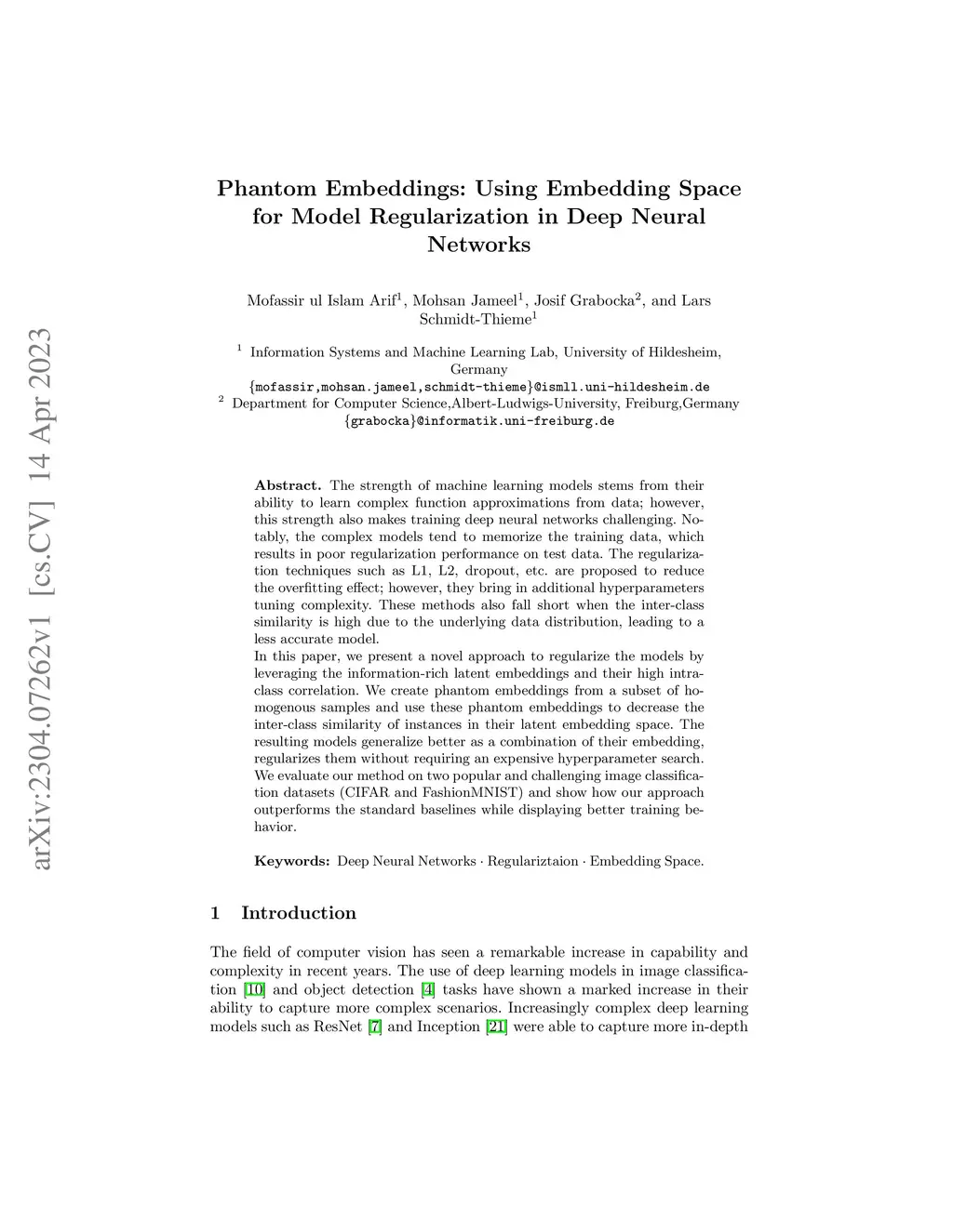 The strength of machine learning models stems from their ability to learn complex function approximations from data; however, this strength also makes training deep neural networks challenging. Notably, the complex models tend to memorize the training data, which results in poor regularization performance on test data. The regularization techniques such as L1, L2, dropout, etc. are proposed to reduce the overfitting effect; however, they bring in additional hyperparameters tuning complexity. These methods also fall short when the inter-class similarity is high due to the underlying data distribution, leading to a less accurate model. In this paper, we present a novel approach to regularize the models by leveraging the information-rich latent embeddings and their high intra-class correlation. We create phantom embeddings from a subset of homogenous samples and use these phantom embeddings to decrease the inter-class similarity of instances in their latent embedding space. The resulting models generalize better as a combination of their embedding and regularize them without requiring an expensive hyperparameter search. We evaluate our method on two popular and challenging image classification datasets (CIFAR and FashionMNIST) and show how our approach outperforms the standard baselines while displaying better training behavior.