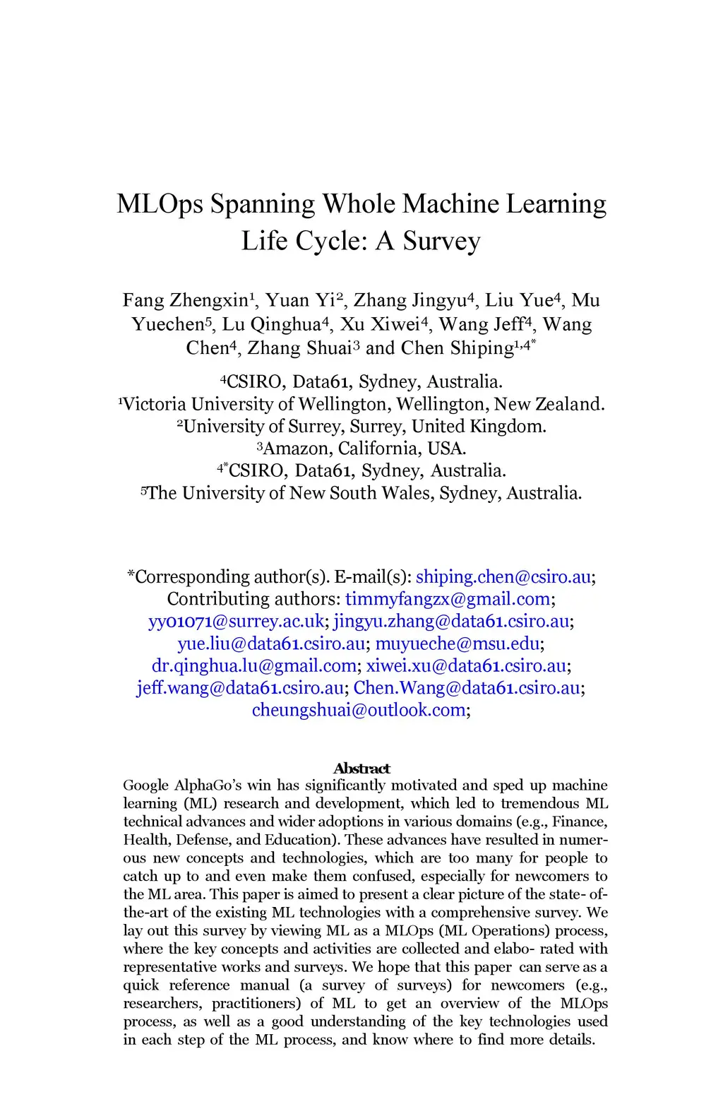 Google AlphaGos win has significantly motivated and sped up machine learning (ML) research and development, which led to tremendous ML technical advances and wider adoptions in various domains (e.g., Finance, Health, Defense, and Education). These advances have resulted in numerous new concepts and technologies, which are too many for people to catch up to and even make them confused, especially for newcomers to the ML area. This paper is aimed to present a clear picture of the state-of-the-art of the existing ML technologies with a comprehensive survey. We lay out this survey by viewing ML as a MLOps (ML Operations) process, where the key concepts and activities are collected and elaborated with representative works and surveys. We hope that this paper can serve as a quick reference manual (a survey of surveys) for newcomers (e.g., researchers, practitioners) of ML to get an overview of the MLOps process, as well as a good understanding of the key technologies used in each step of the ML process, and know where to find more details.