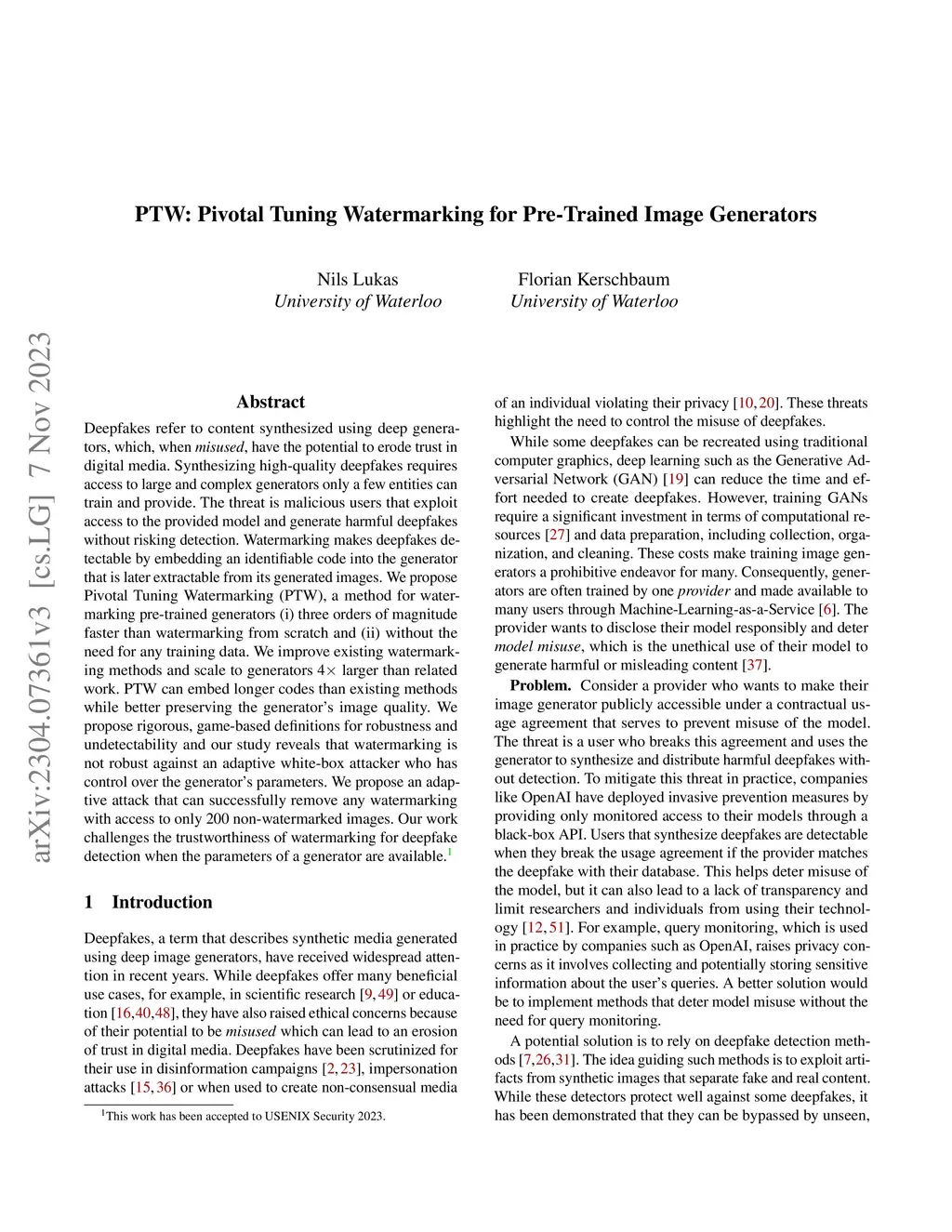 Deepfakes refer to content synthesized using deep generators, which, when misused, have the potential to erode trust in digital media. Synthesizing high-quality deepfakes requires access to large and complex generators only a few entities can train and provide. The threat is malicious users that exploit access to the provided model and generate harmful deepfakes without risking detection. Watermarking makes deepfakes detectable by embedding an identifiable code into the generator that is later extractable from its generated images. We propose Pivotal Tuning Watermarking (PTW), a method for watermarking pre-trained generators (i) three orders of magnitude faster than watermarking from scratch and (ii) without the need for any training data. We improve existing watermarking methods and scale to generators larger than related work. PTW can embed longer codes than existing methods while better preserving the generator's image quality. We propose rigorous, game-based definitions for robustness and undetectability, and our study reveals that watermarking is not robust against an adaptive white-box attacker who controls the generator's parameters. We propose an adaptive attack that can successfully remove any watermarking with access to only 200 non-watermarked images. Our work challenges the trustworthiness of watermarking for deepfake detection when the parameters of a generator are available. The source code to reproduce our experiments is available at https://github.com/nilslukas/gan-watermark.