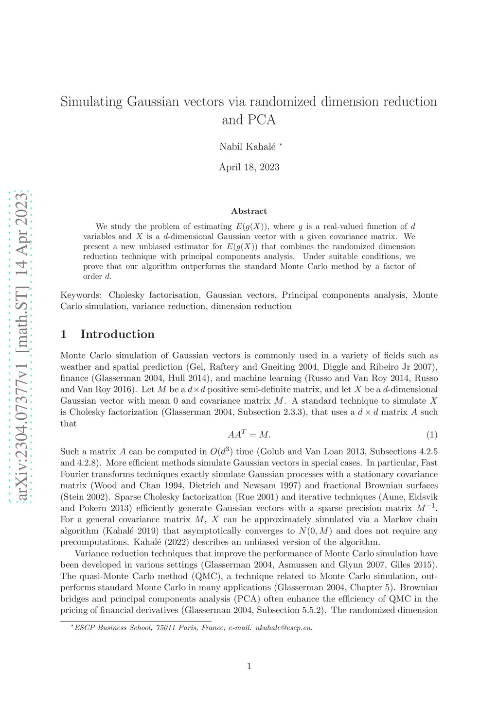We study the problem of estimating E(g(X)), where g is a real-valued function of d variables and X is a d-dimensional Gaussian vector with a given covariance matrix. We present a new unbiased estimator for E(g(X)) that combines the randomized dimension reduction technique with principal components analysis. Under suitable conditions, we prove that our algorithm outperforms the standard Monte Carlo method by a factor of order d.