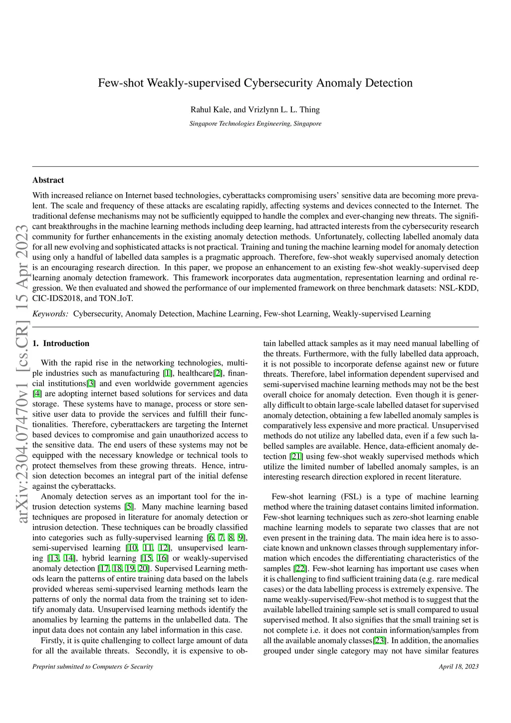 With increased reliance on Internet based technologies, cyberattacks compromising users' sensitive data are becoming more prevalent. The scale and frequency of these attacks are escalating rapidly, affecting systems and devices connected to the Internet. The traditional defense mechanisms may not be sufficiently equipped to handle the complex and ever-changing new threats. The significant breakthroughs in the machine learning methods including deep learning, had attracted interests from the cybersecurity research community for further enhancements in the existing anomaly detection methods. Unfortunately, collecting labelled anomaly data for all new evolving and sophisticated attacks is not practical. Training and tuning the machine learning model for anomaly detection using only a handful of labelled data samples is a pragmatic approach. Therefore, few-shot weakly supervised anomaly detection is an encouraging research direction. In this paper, we propose an enhancement to an existing few-shot weakly-supervised deep learning anomaly detection framework. This framework incorporates data augmentation, representation learning and ordinal regression. We then evaluated and showed the performance of our implemented framework on three benchmark datasets: NSL-KDD, CIC-IDS2018, and TON_IoT.