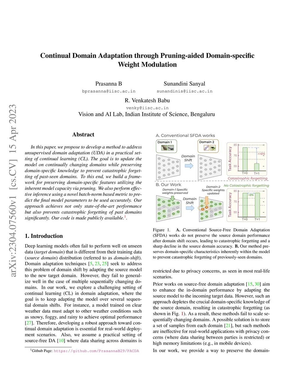 Continual Domain Adaptation through Pruning-aided Domain-specific Weight