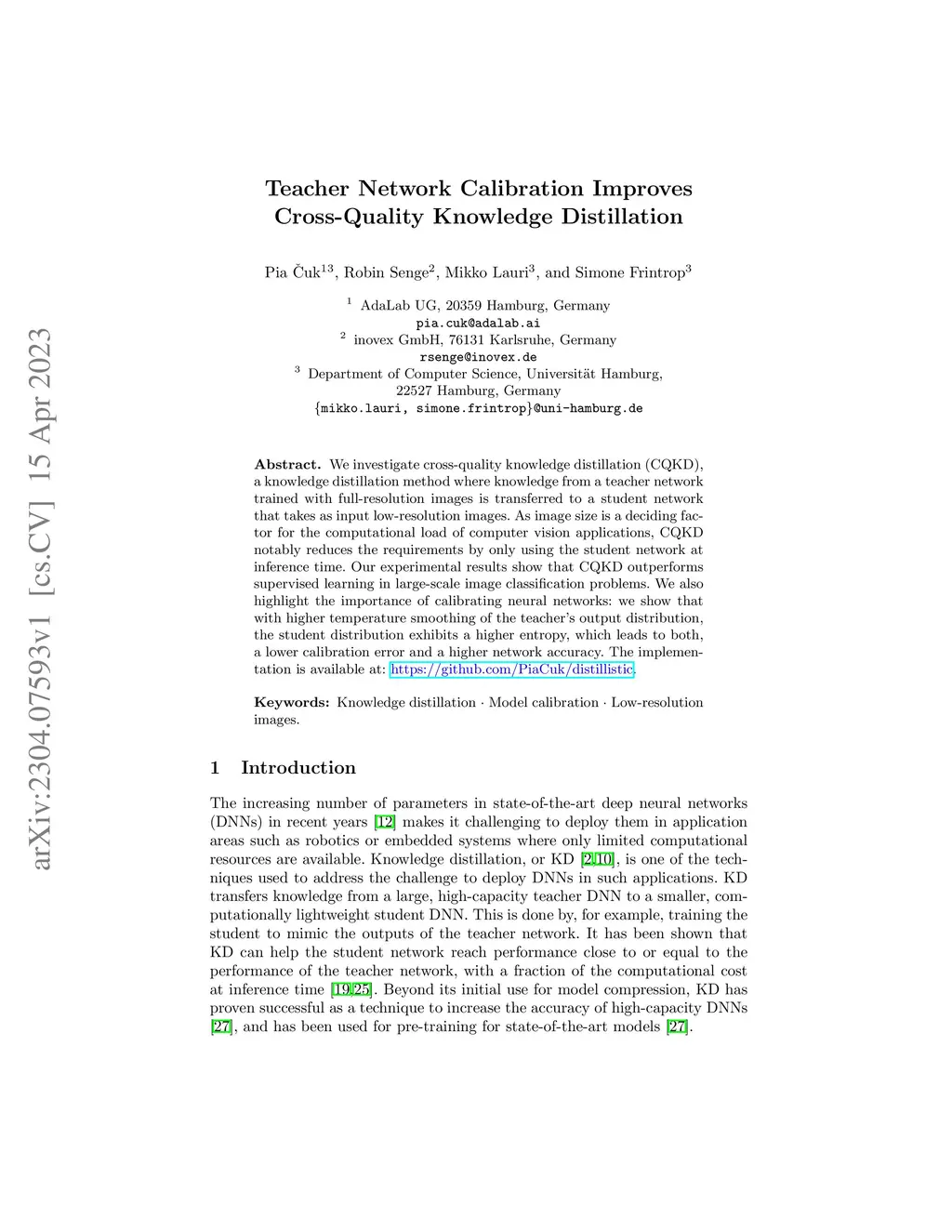 We investigate cross-quality knowledge distillation (CQKD), a knowledge distillation method where knowledge from a teacher network trained with full-resolution images is transferred to a student network that takes as input low-resolution images. As image size is a deciding factor for the computational load of computer vision applications, CQKD notably reduces the requirements by only using the student network at inference time. Our experimental results show that CQKD outperforms supervised learning in large-scale image classification problems. We also highlight the importance of calibrating neural networks: we show that with higher temperature smoothing of the teacher's output distribution, the student distribution exhibits a higher entropy, which leads to both, a lower calibration error and a higher network accuracy.