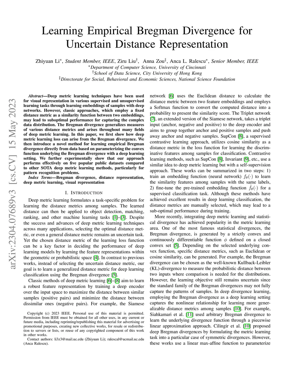 Deep metric learning techniques have been used for visual representation in various supervised and unsupervised learning tasks through learning embeddings of samples with deep networks. However, classic approaches, which employ a fixed distance metric as a similarity function between two embeddings, may lead to suboptimal performance for capturing the complex data distribution. The Bregman divergence generalizes measures of various distance metrics and arises throughout many fields of deep metric learning. In this paper, we first show how deep metric learning loss can arise from the Bregman divergence. We then introduce a novel method for learning empirical Bregman divergence directly from data based on parameterizing the convex function underlying the Bregman divergence with a deep learning setting. We further experimentally show that our approach performs effectively on five popular public datasets compared to other SOTA deep metric learning methods, particularly for pattern recognition problems.