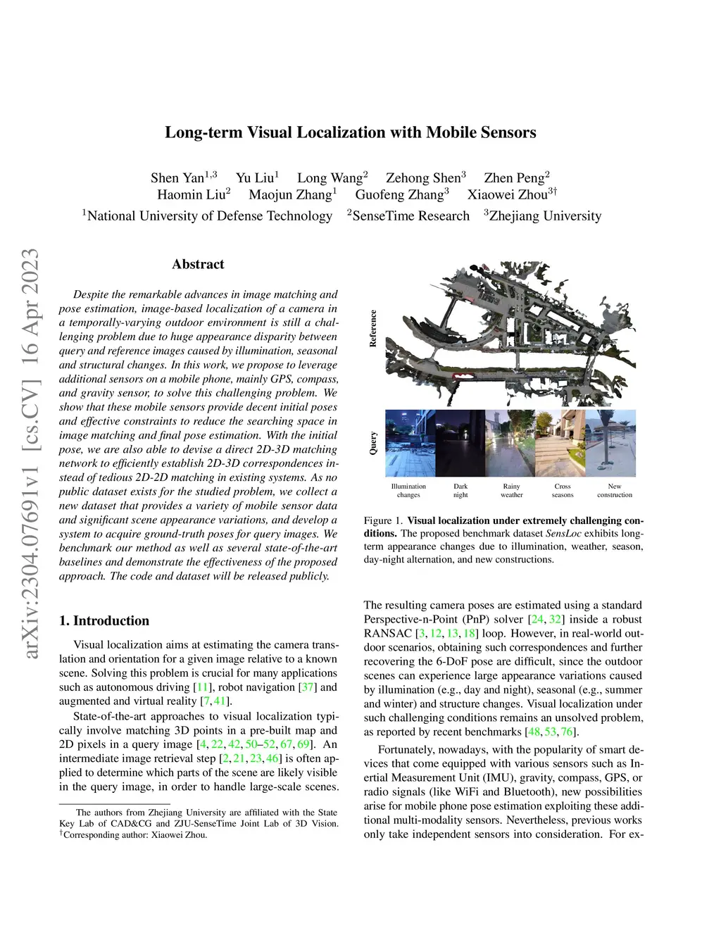 Despite the remarkable advances in image matching and pose estimation, image-based localization of a camera in a temporally-varying outdoor environment is still a challenging problem due to huge appearance disparity between query and reference images caused by illumination, seasonal and structural changes. In this work, we propose to leverage additional sensors on a mobile phone, mainly GPS, compass, and gravity sensor, to solve this challenging problem. We show that these mobile sensors provide decent initial poses and effective constraints to reduce the searching space in image matching and final pose estimation. With the initial pose, we are also able to devise a direct 2D-3D matching network to efficiently establish 2D-3D correspondences instead of tedious 2D-2D matching in existing systems. As no public dataset exists for the studied problem, we collect a new dataset that provides a variety of mobile sensor data and significant scene appearance variations, and develop a system to acquire ground-truth poses for query images. We benchmark our method as well as several state-of-the-art baselines and demonstrate the effectiveness of the proposed approach. The code and dataset will be released publicly.