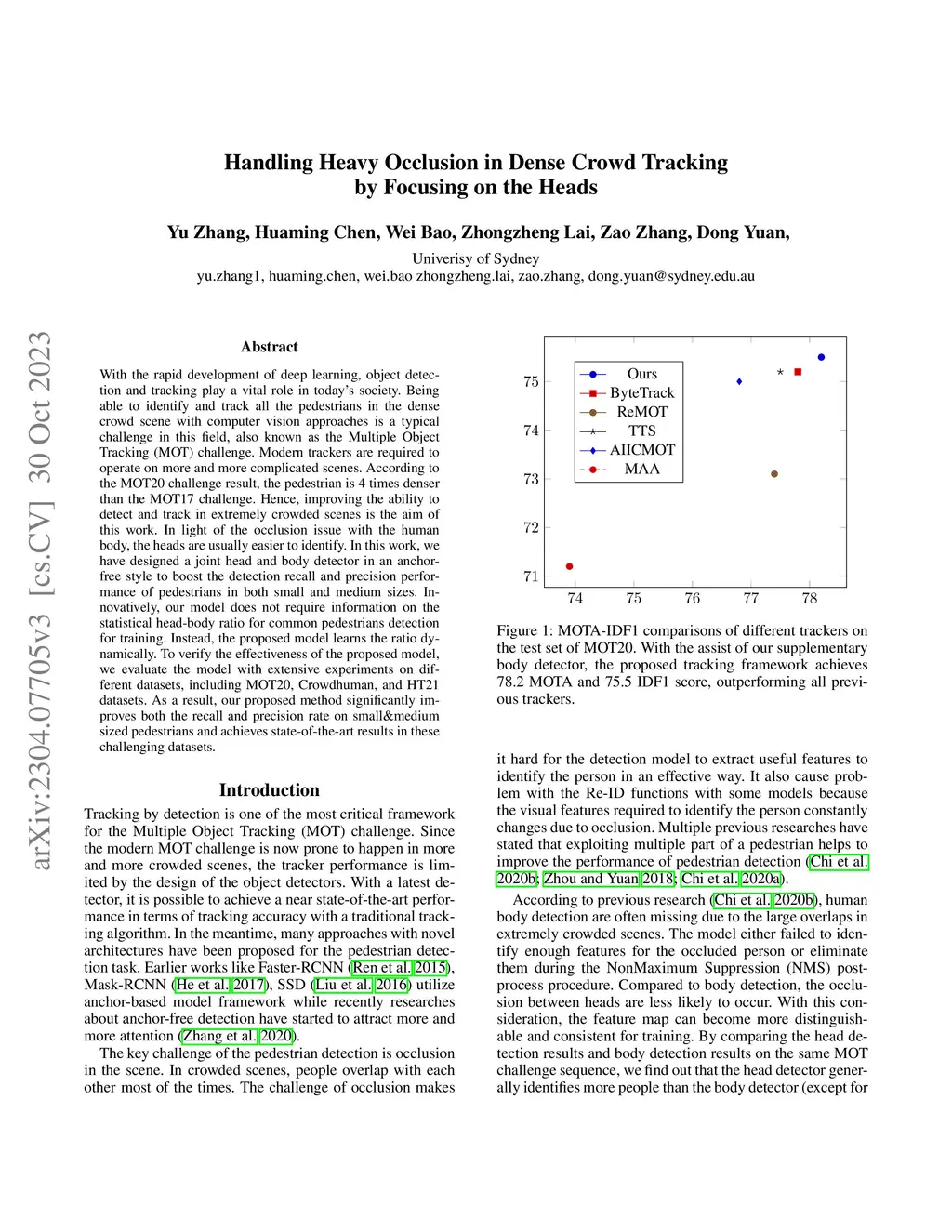 With the rapid development of deep learning, object detection and tracking play a vital role in today's society. Being able to identify and track all the pedestrians in the dense crowd scene with computer vision approaches is a typical challenge in this field, also known as the Multiple Object Tracking (MOT) challenge. Modern trackers are required to operate on more and more complicated scenes. According to the MOT20 challenge result, the pedestrian is 4 times denser than the MOT17 challenge. Hence, improving the ability to detect and track in extremely crowded scenes is the aim of this work. In light of the occlusion issue with the human body, the heads are usually easier to identify. In this work, we have designed a joint head and body detector in an anchor-free style to boost the detection recall and precision performance of pedestrians in both small and medium sizes. Innovatively, our model does not require information on the statistical head-body ratio for common pedestrians detection for training. Instead, the proposed model learns the ratio dynamically. To verify the effectiveness of the proposed model, we evaluate the model with extensive experiments on different datasets, including MOT20, Crowdhuman, and HT21 datasets. As a result, our proposed method significantly improves both the recall and precision rate on small & medium sized pedestrians and achieves state-of-the-art results in these challenging datasets.