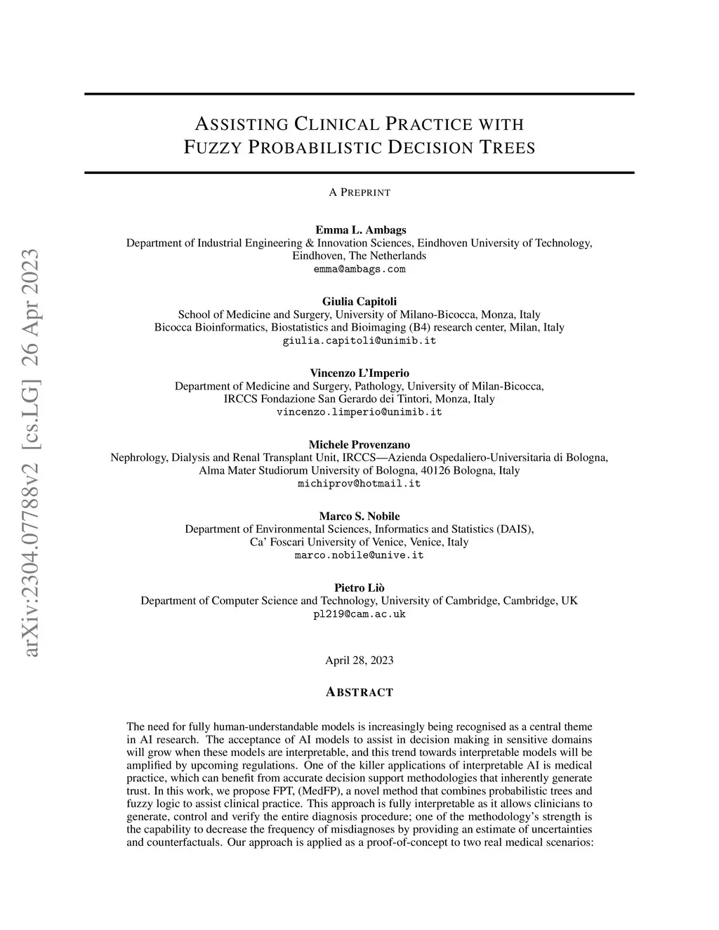 The need for fully human-understandable models is increasingly being recognised as a central theme in AI research. The acceptance of AI models to assist in decision making in sensitive domains will grow when these models are interpretable, and this trend towards interpretable models will be amplified by upcoming regulations. One of the killer applications of interpretable AI is medical practice, which can benefit from accurate decision support methodologies that inherently generate trust. In this work, we propose FPT, (MedFP), a novel method that combines probabilistic trees and fuzzy logic to assist clinical practice. This approach is fully interpretable as it allows clinicians to generate, control and verify the entire diagnosis procedure; one of the methodology's strength is the capability to decrease the frequency of misdiagnoses by providing an estimate of uncertainties and counterfactuals. Our approach is applied as a proof-of-concept to two real medical scenarios: classifying malignant thyroid nodules and predicting the risk of progression in chronic kidney disease patients. Our results show that probabilistic fuzzy decision trees can provide interpretable support to clinicians, furthermore, introducing fuzzy variables into the probabilistic model brings significant nuances that are lost when using the crisp thresholds set by traditional probabilistic decision trees. We show that FPT and its predictions can assist clinical practice in an intuitive manner, with the use of a user-friendly interface specifically designed for this purpose. Moreover, we discuss the interpretability of the FPT model.