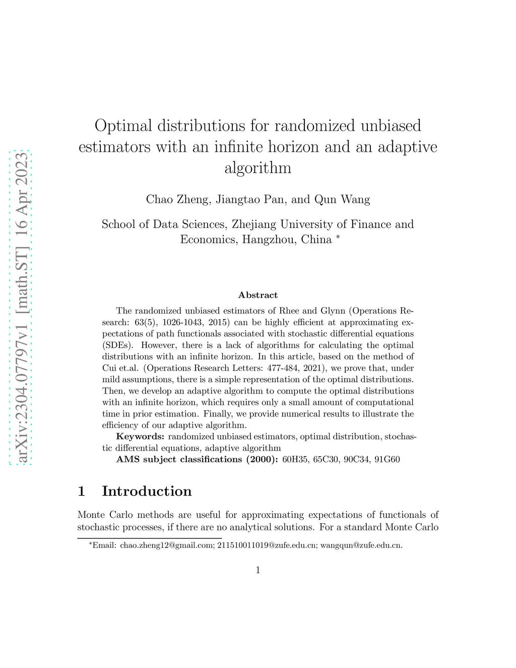 The randomized unbiased estimators of Rhee and Glynn (Operations Research:63(5), 1026-1043, 2015) can be highly efficient at approximating expectations of path functionals associated with stochastic differential equations (SDEs). However, there is a lack of algorithms for calculating the optimal distributions with an infinite horizon. In this article, based on the method of Cui et.al. (Operations Research Letters: 477-484, 2021), we prove that, under mild assumptions, there is a simple representation of the optimal distributions. Then, we develop an adaptive algorithm to compute the optimal distributions with an infinite horizon, which requires only a small amount of computational time in prior estimation. Finally, we provide numerical results to illustrate the efficiency of our adaptive algorithm.